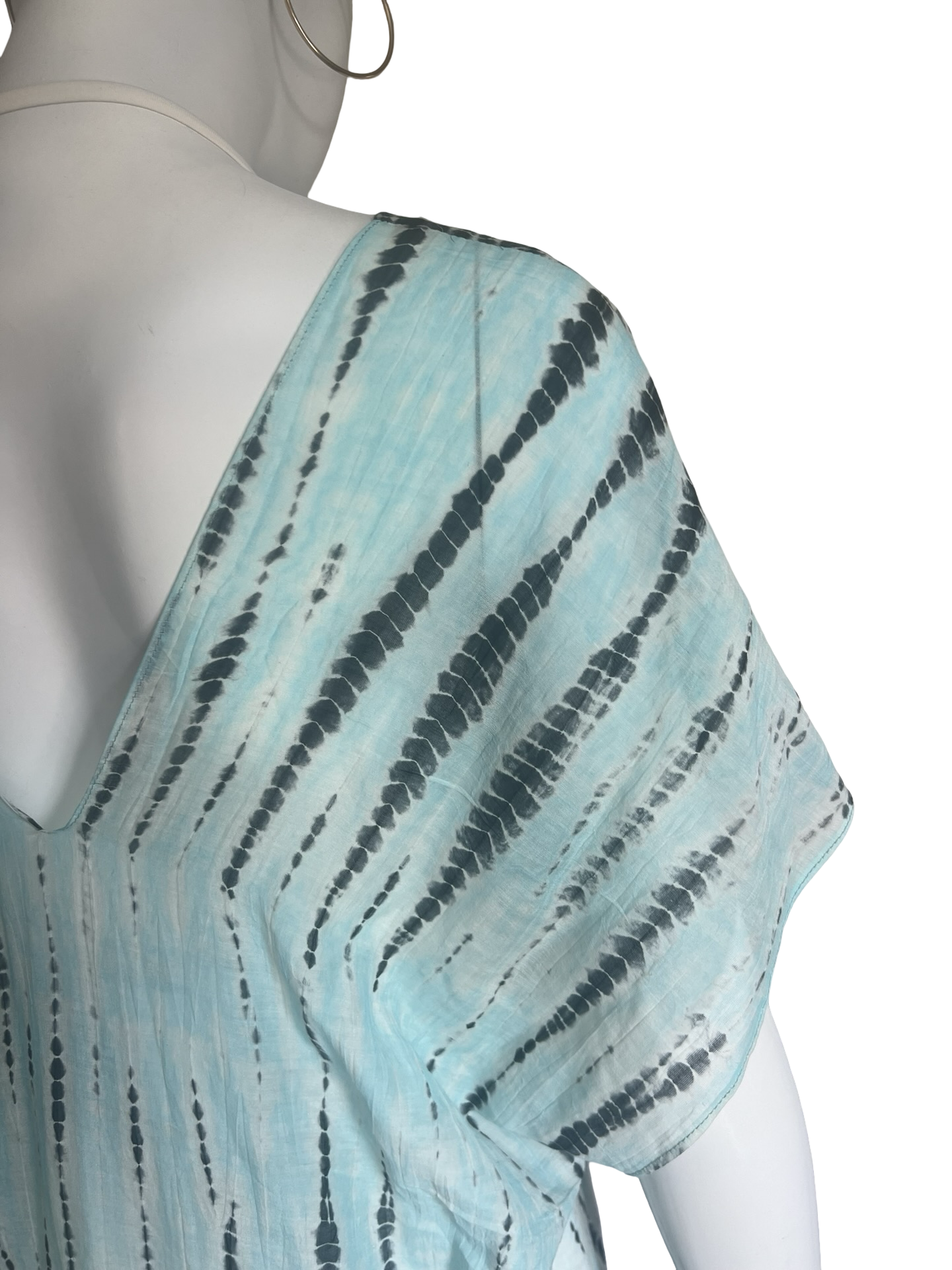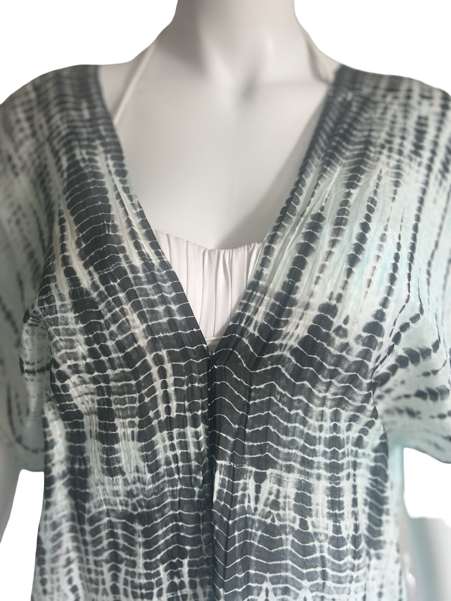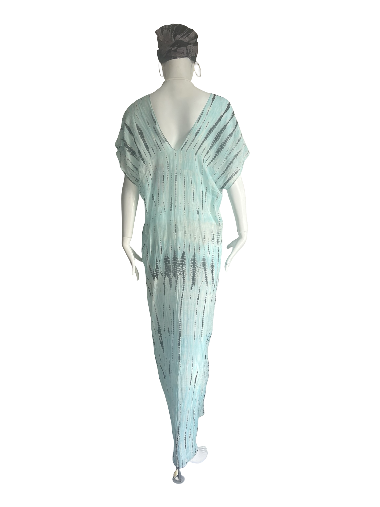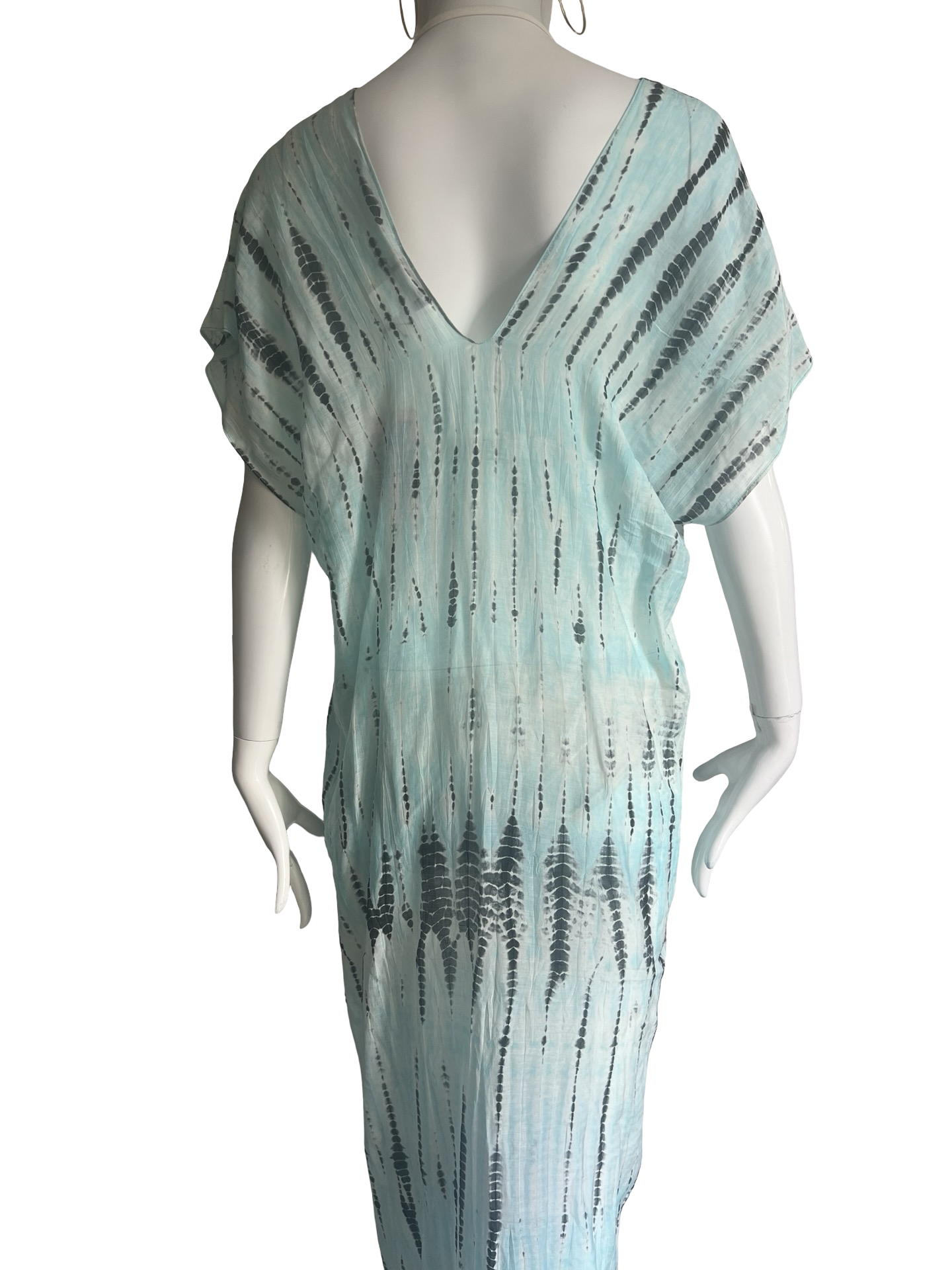Our New Shape "Narrow Caftan Dress with Slit" is a simple shape - Throw on and Go garment. Its a column shape using the width of the cotton/silk and the circumference is 40/41" around the body including hips, so we are therefor calling the size S/M. It has a simple V-neckline using the FINE handmade silk selvage as neckline finish. The front has a 20" slit using the same finish as neckline. The Kaftan is Very "LUXE Chic" yet has a relaxed Resort Look especially in this very soft Cotton/Silk fabrication. The fabric is hand tie dyed and every line in the print has been places with much care and precision, makes this stand out in a crowd. The cotton/silk is very slightly sheer but not see through. We have layered a bikini under the garment to show the transparency.