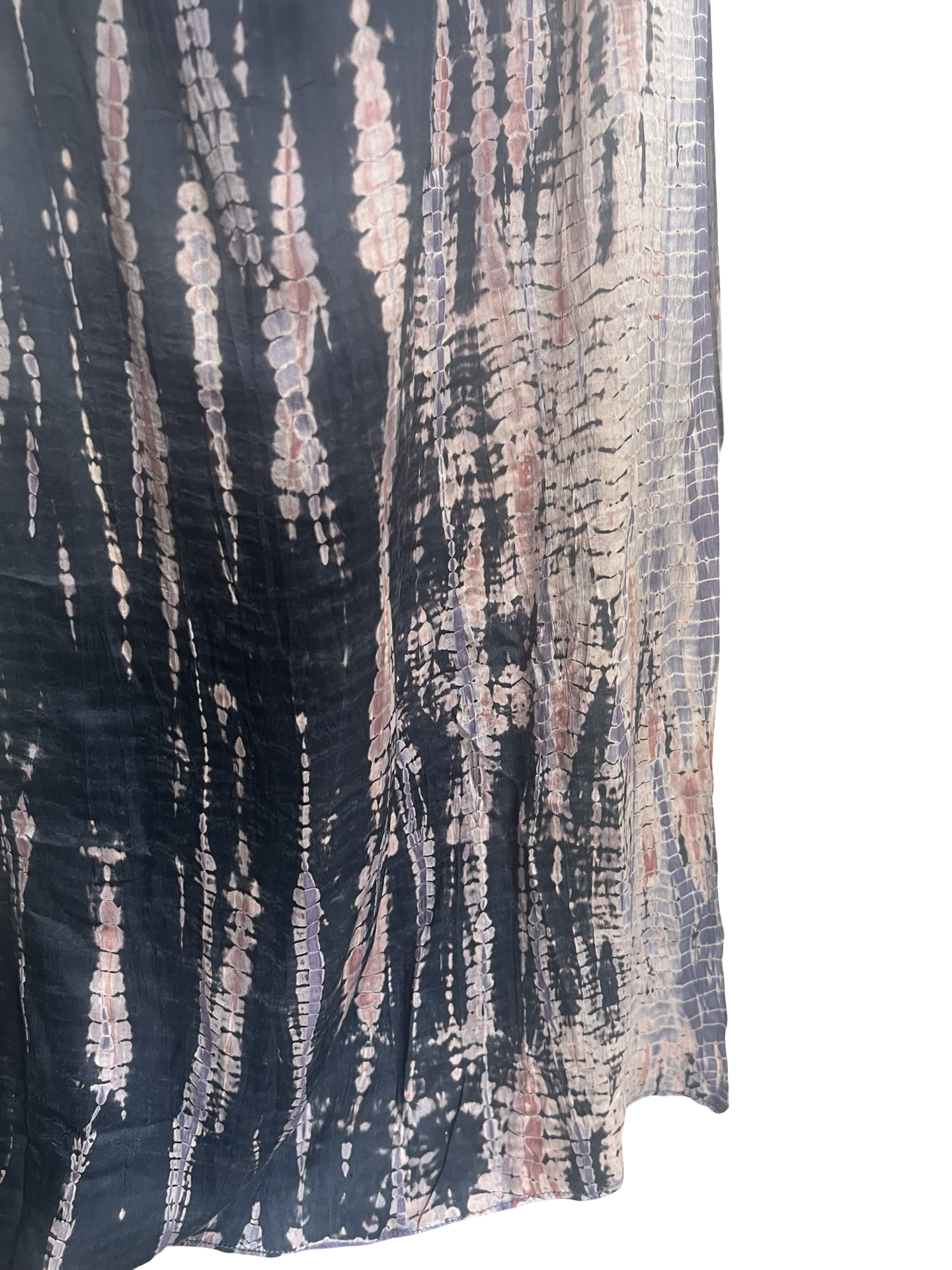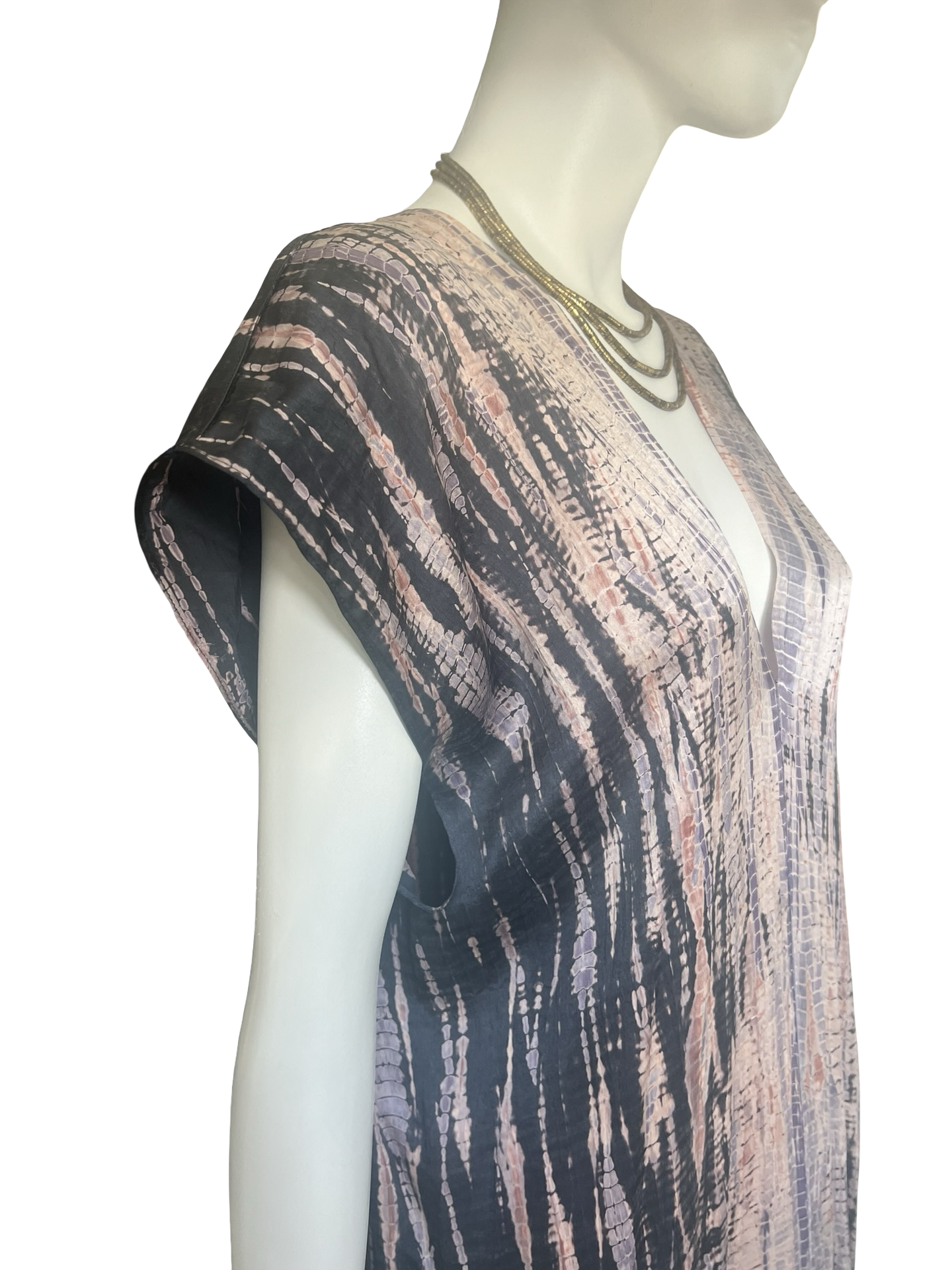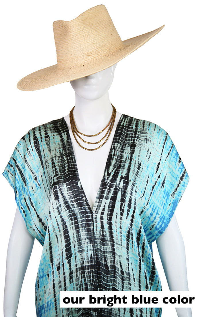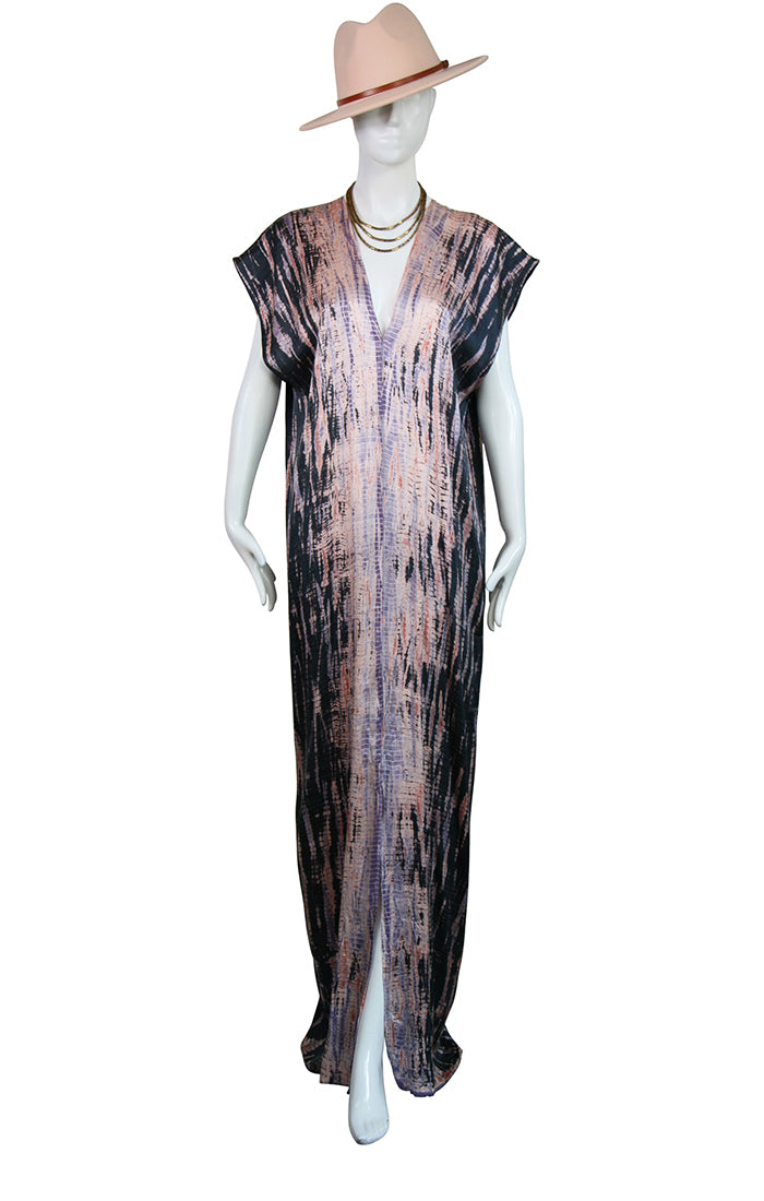 Our New Shape "Narrow Caftan Dress with Slit" is a simple shape - Throw on and Go garment. Its a column shape using the width of the silk and the circumference is 40/41" around the body including hips, so we are therefor calling the size S/M. It has a simple V-neckline using the FINE handmade silk selvage as neckline finish. The front has a 20" slit using the same finish as neckline. The Kaftan is Very "LUXE Chic" yet has a relaxed Resort Look. The High End Silk Charmeuse fabrication, thats hand tie dyed and every line in the print has been places with much care and precision, makes this stand out in a crowd.