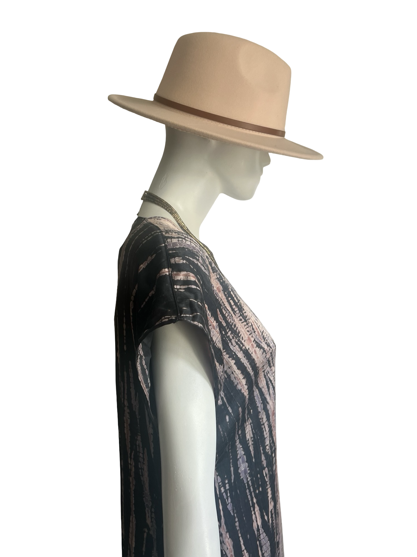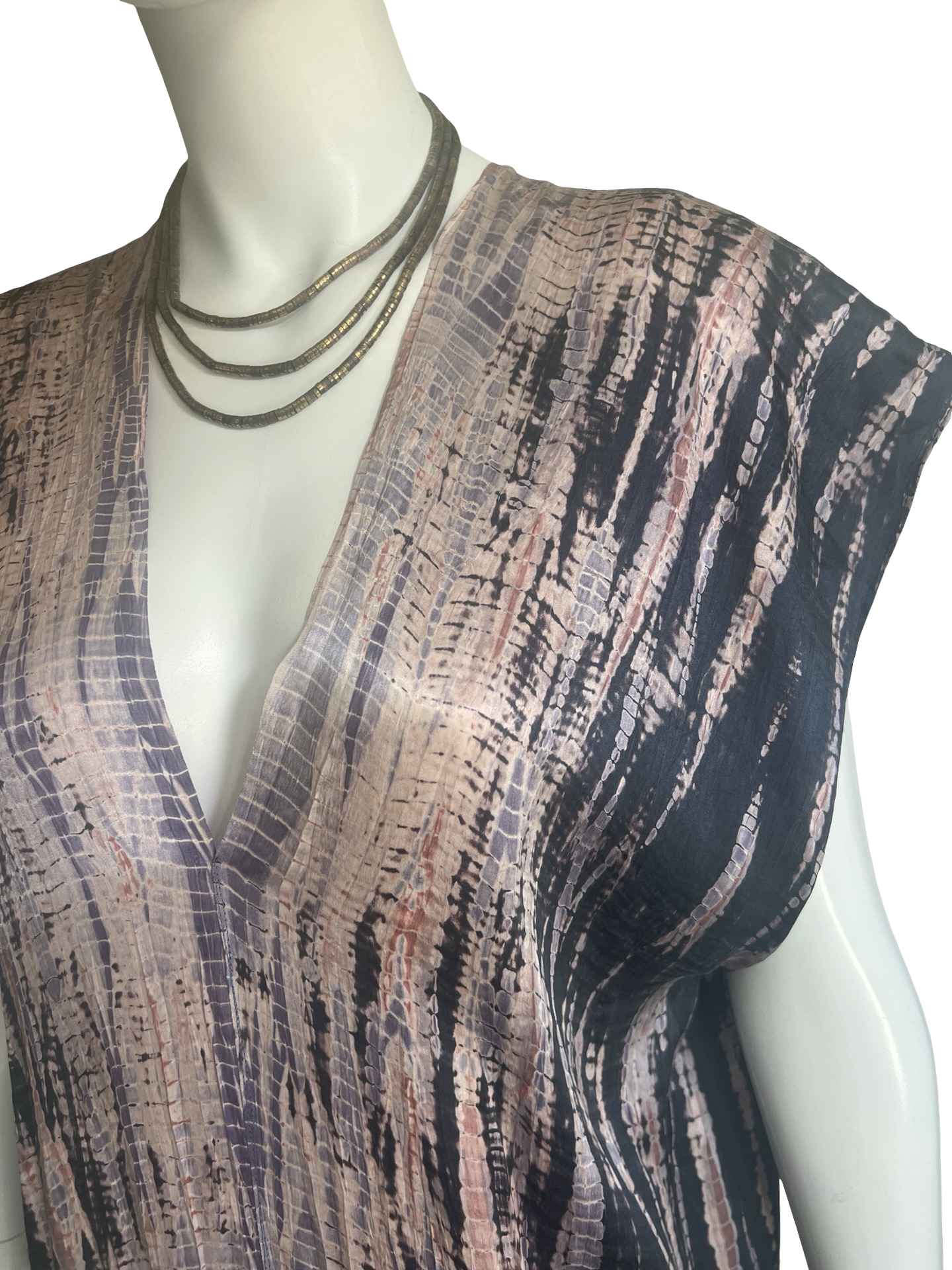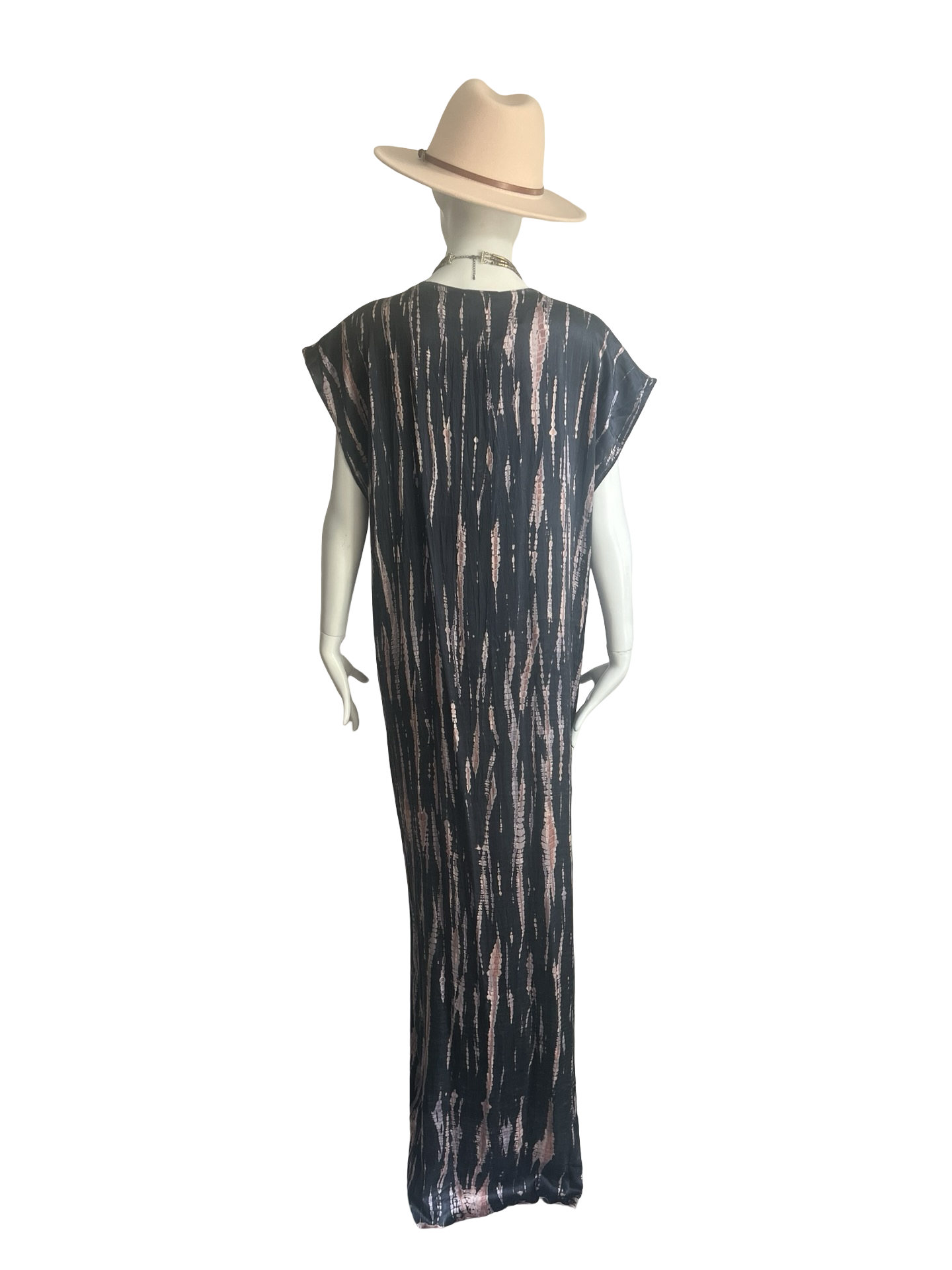 Our New Shape "Narrow Caftan Dress with Slit" is a simple shape - Throw on and Go garment. Its a column shape using the width of the silk and the circumference is 40/41" around the body including hips, so we are therefor calling the size S/M. It has a simple V-neckline using the FINE handmade silk selvage as neckline finish. The front has a 20" slit using the same finish as neckline. The Kaftan is Very "LUXE Chic" yet has a relaxed Resort Look. The High End Silk Charmeuse fabrication, thats hand tie dyed and every line in the print has been places with much care and precision, makes this stand out in a crowd.