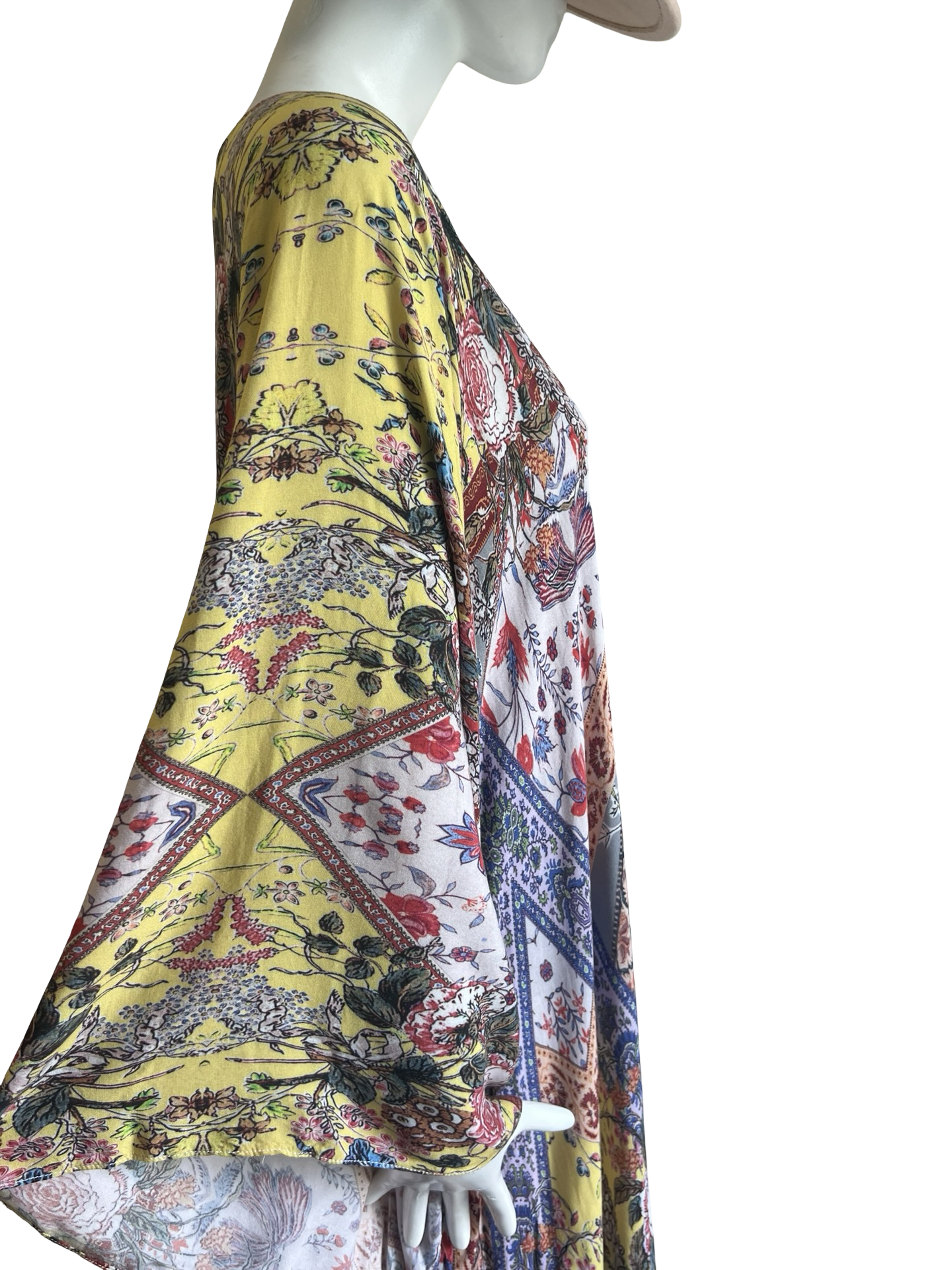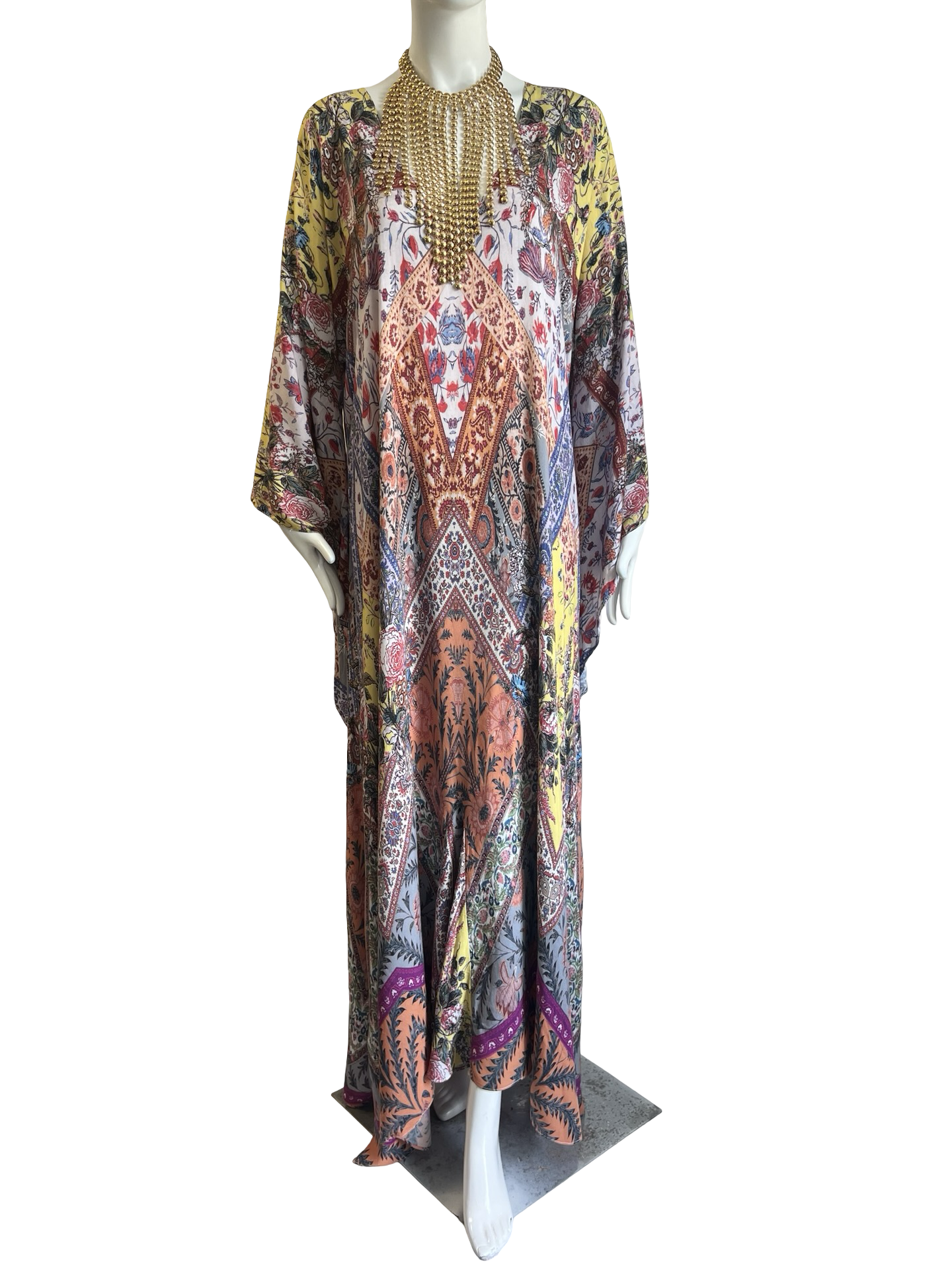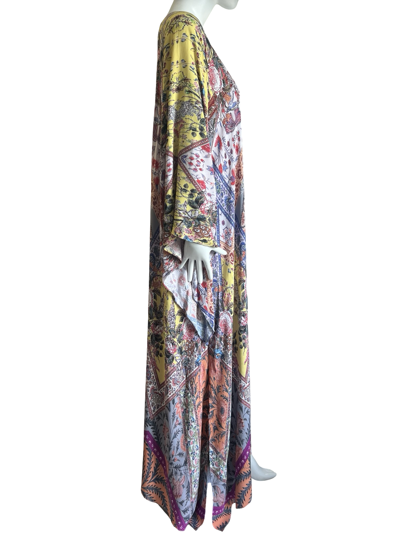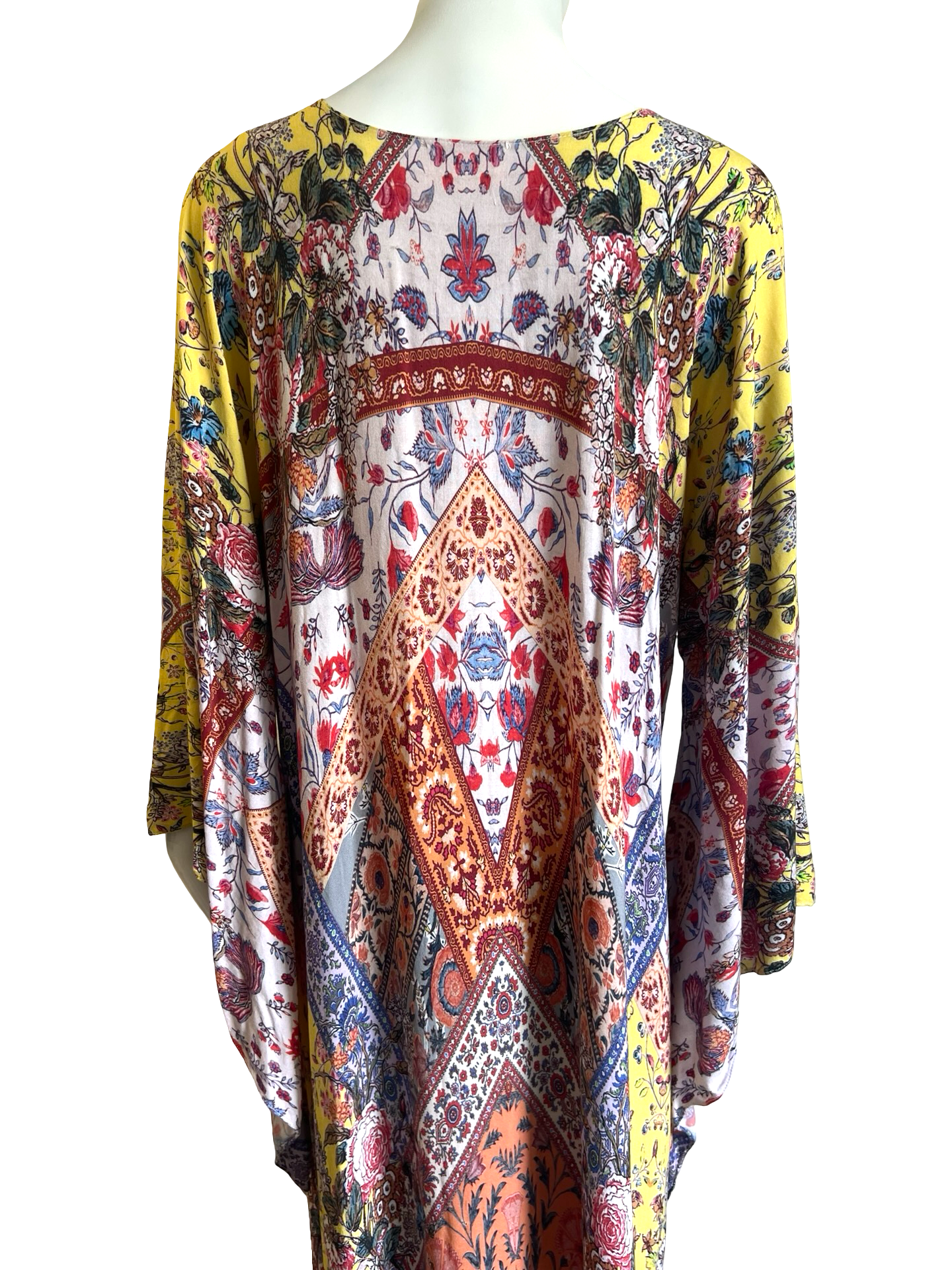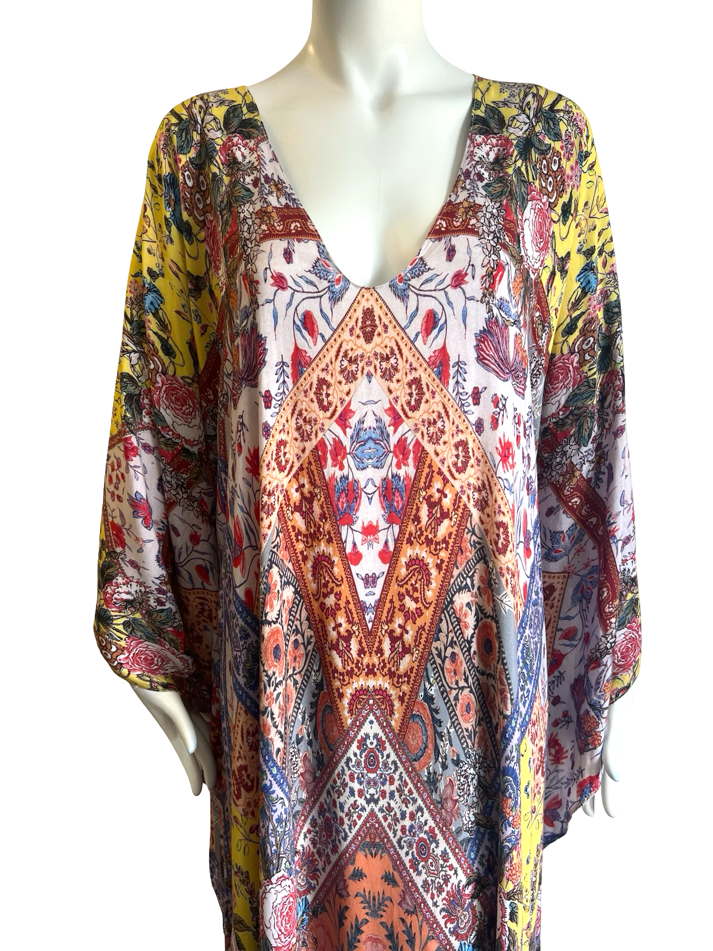 Our "Solstice Caftan Dress " is made in a very soft Rayon in our beautiful Solstice signature Lotta print. The kaftan has a simple soft V neckline front and back and its a caftan dress with a soft shape and Aline hem. The front hemline has a godet and the sides have 20" slits. The sleeve is a teardrop wing shape which gives the dress a Boho Hippie Vibe. Its a One size and fits anyone S-L.