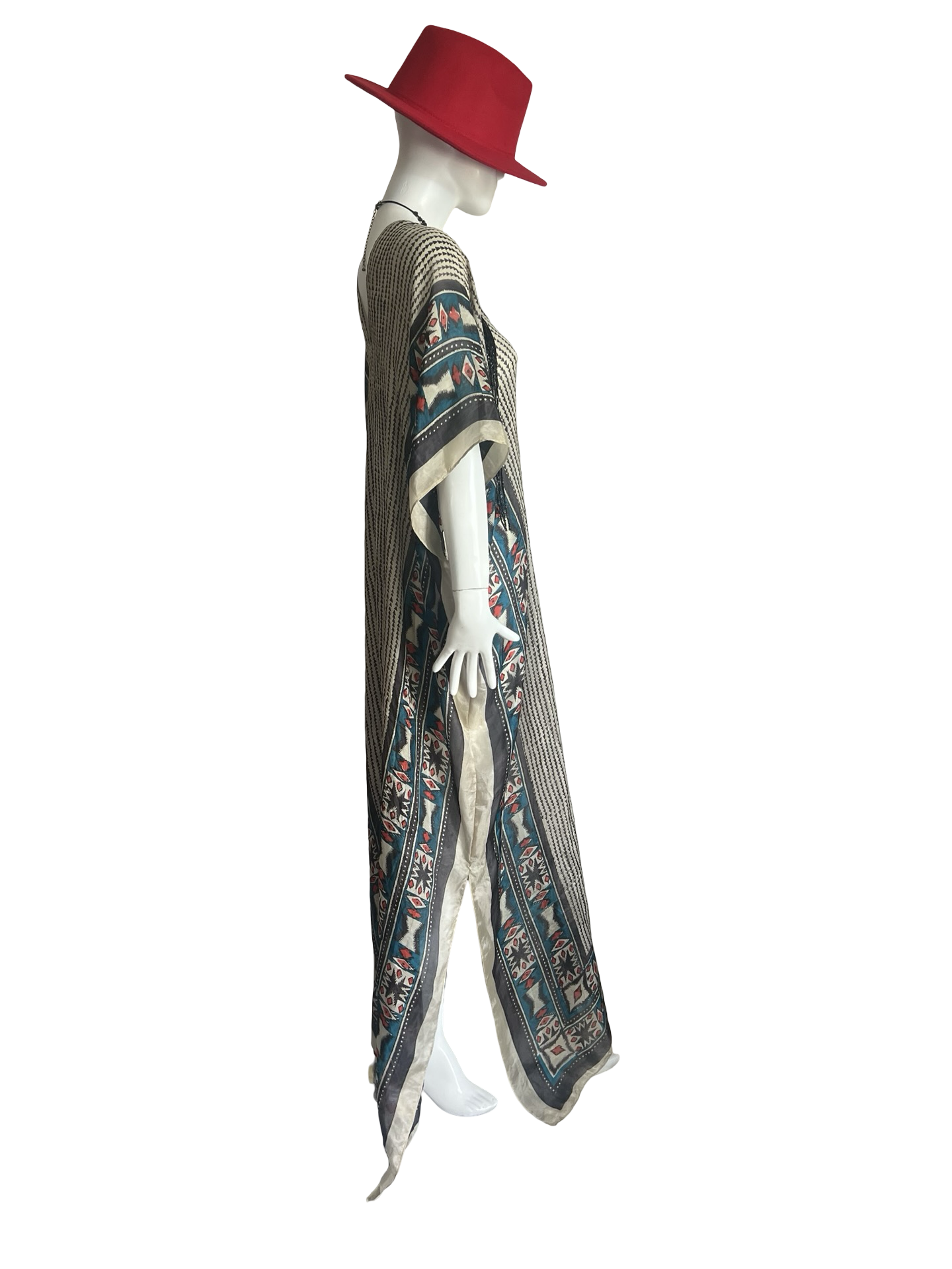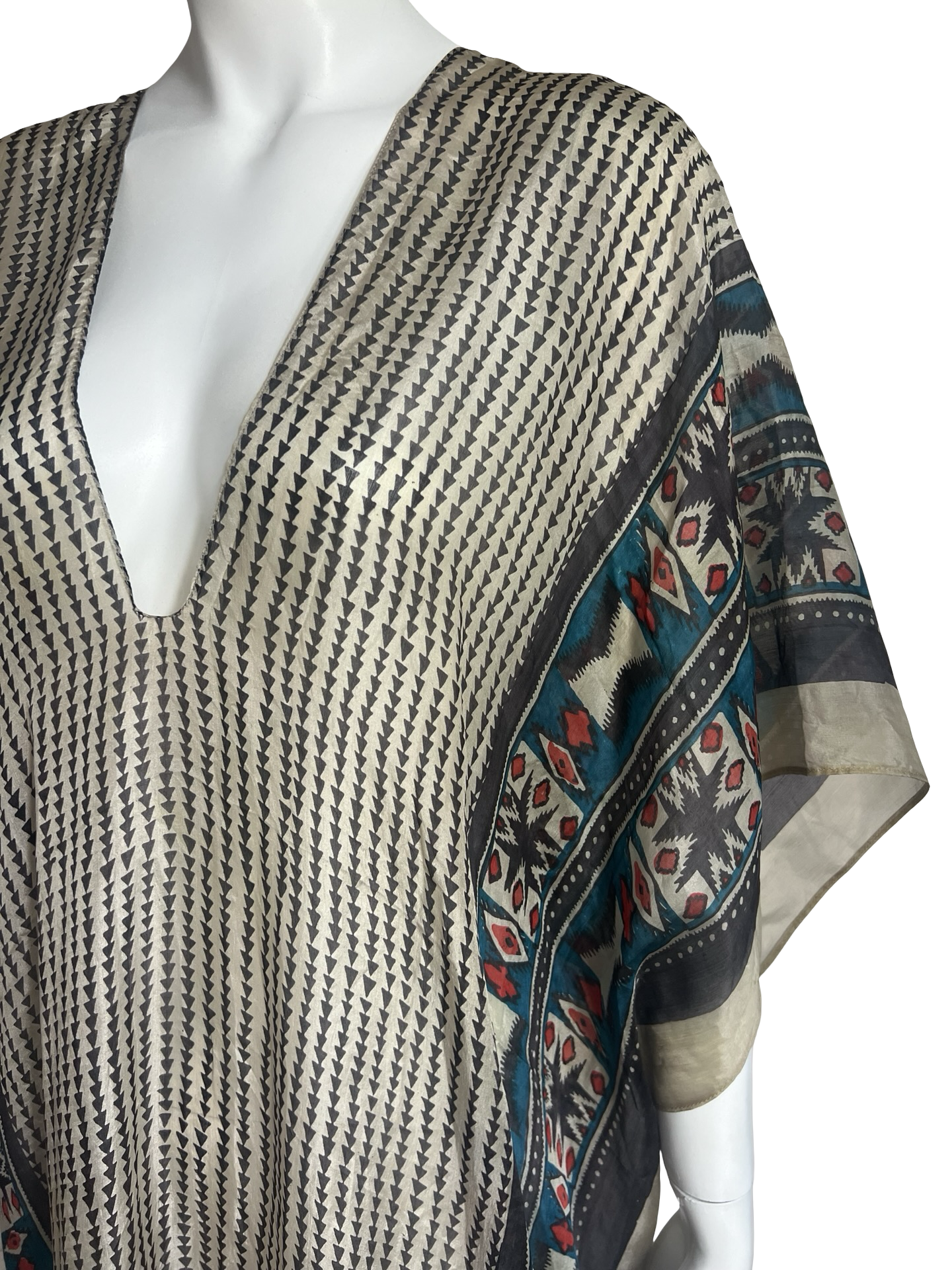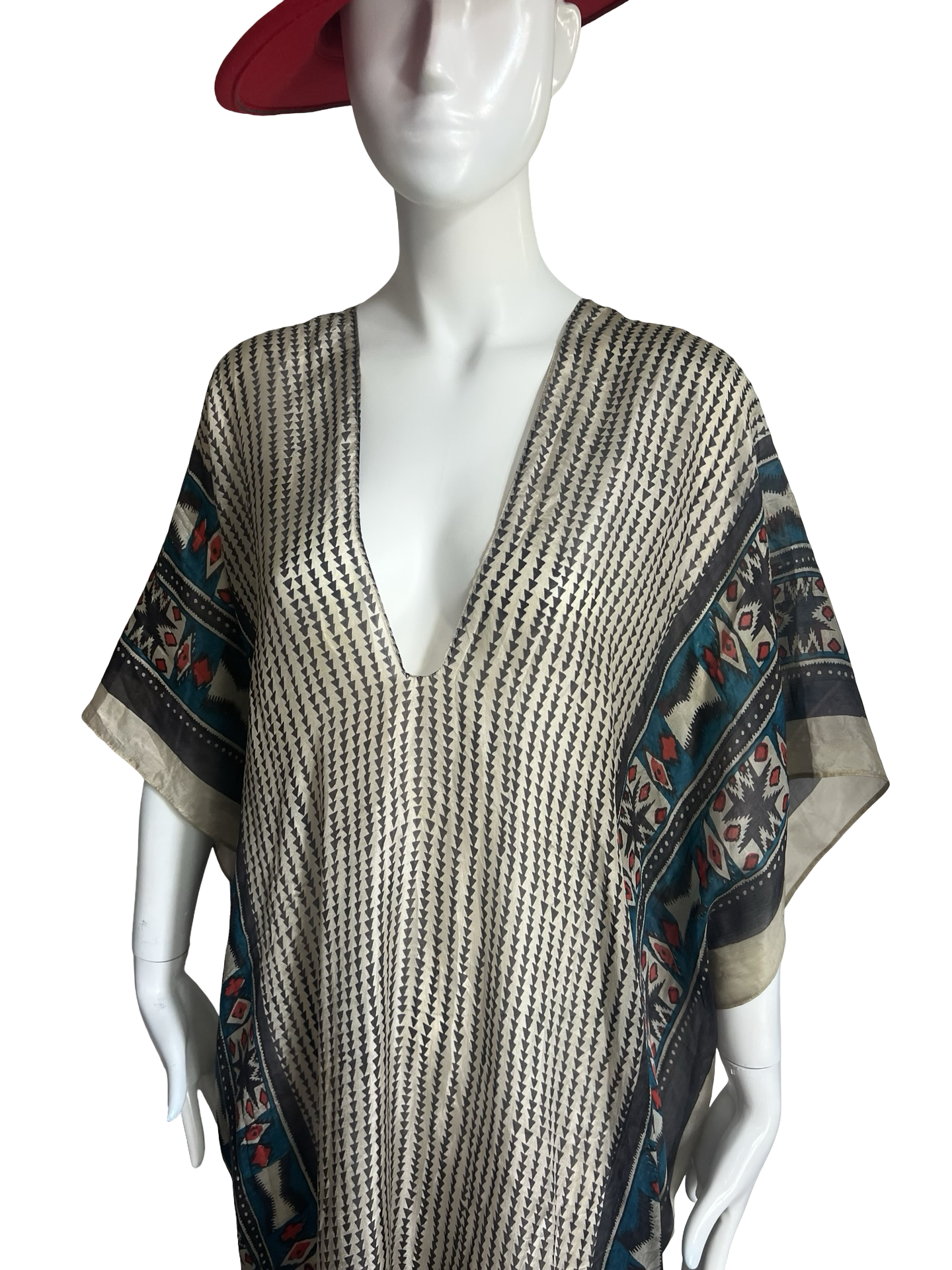 Our "Long V-Neck Kaftan" in our beautiful Silk Tabi quality is an easy but elegant kaftan to throw on and go. V-neckline front and back and side slits on both sides about 20" high. Great over swimwear or worn over a slip dress for day. The kaftan is a One Size fits all and can accommodate XS-2XL.