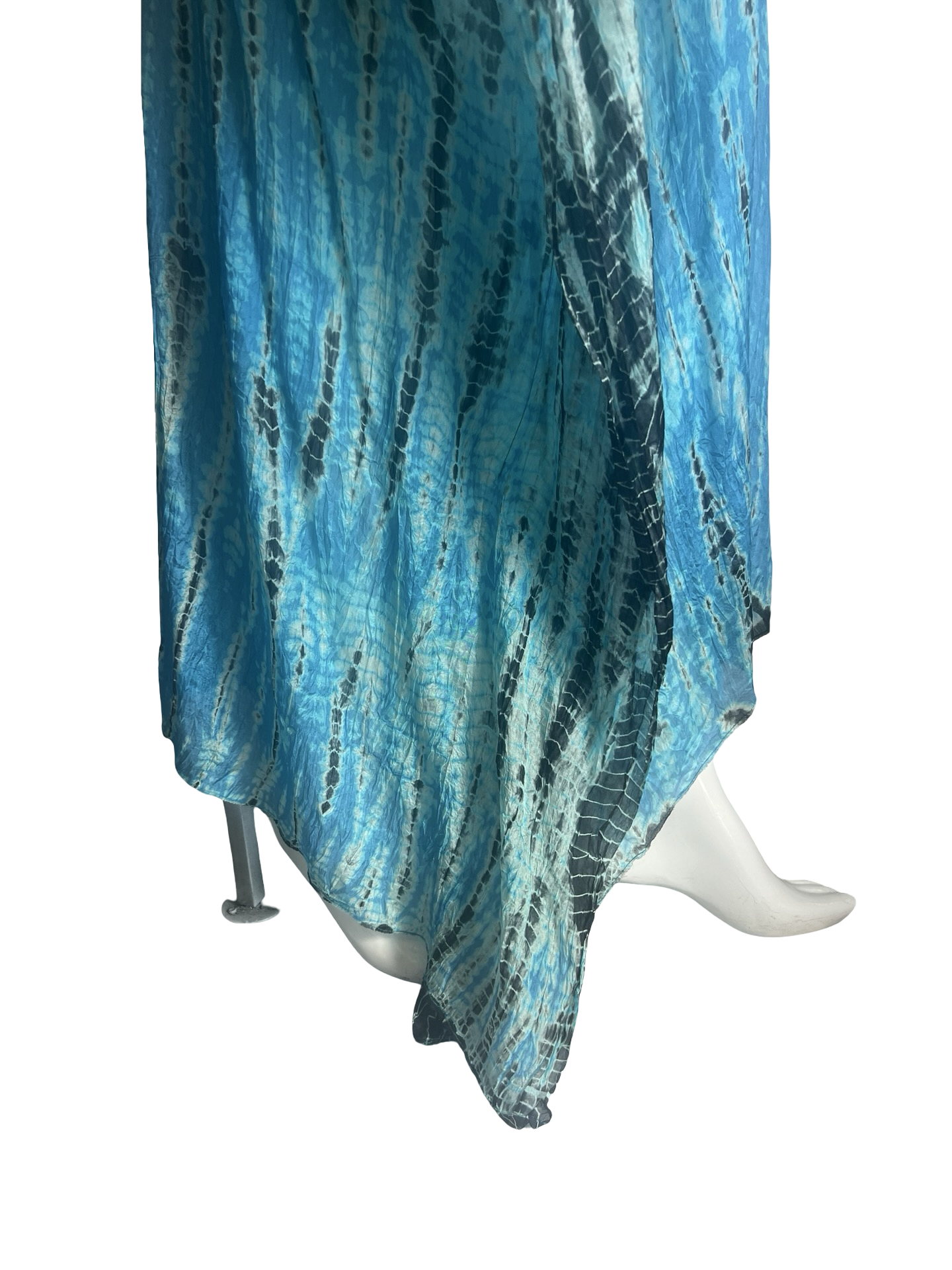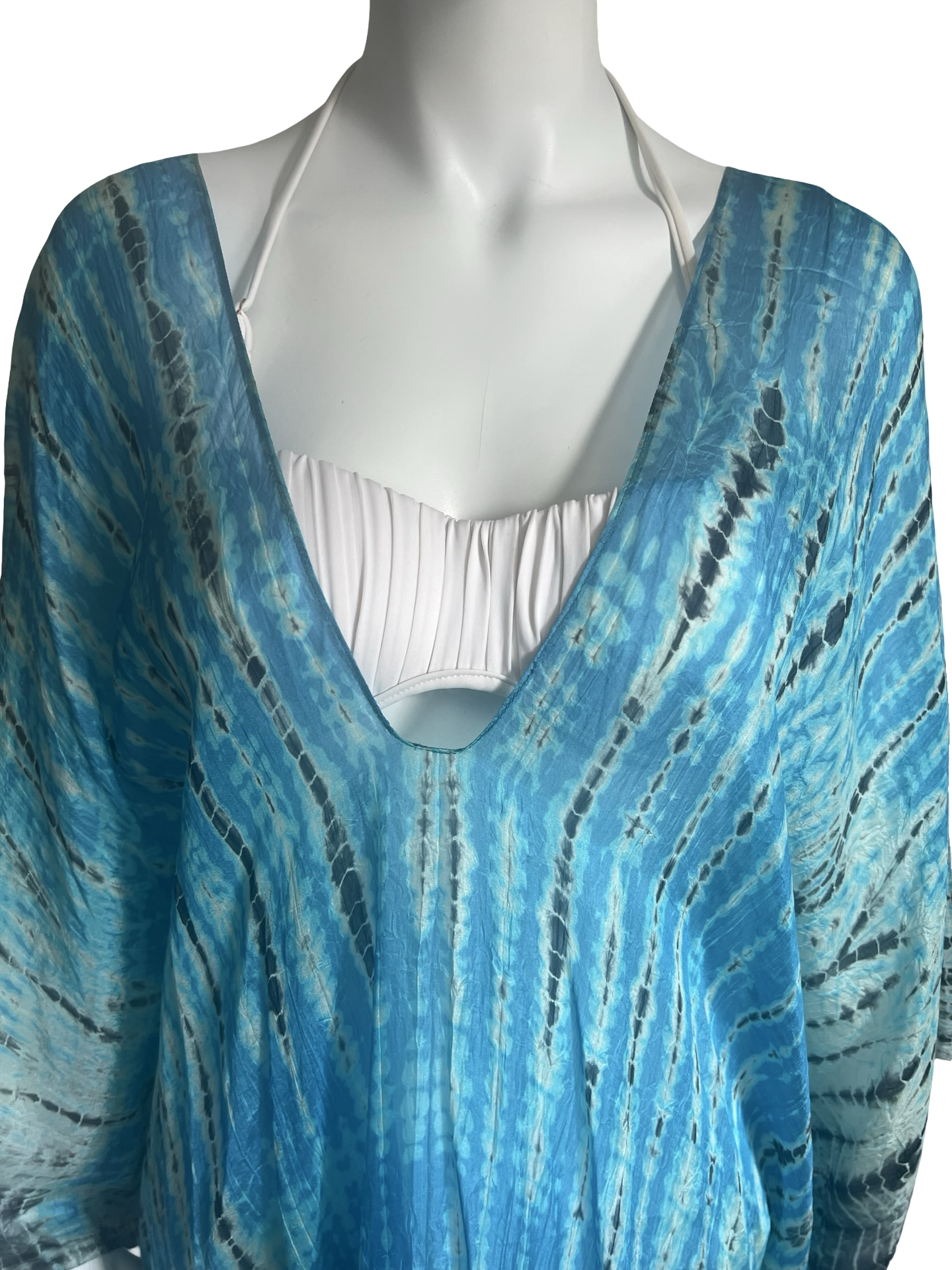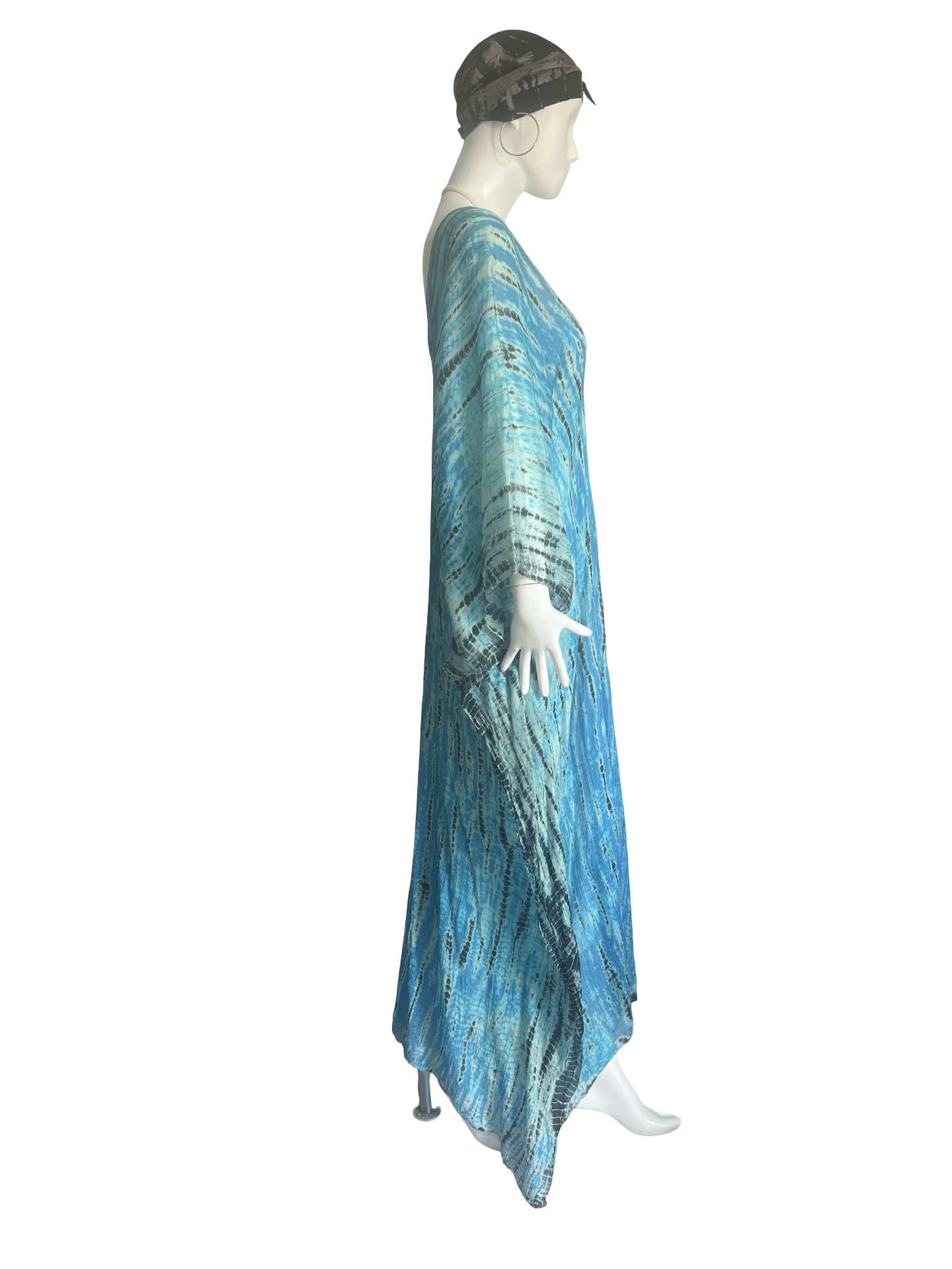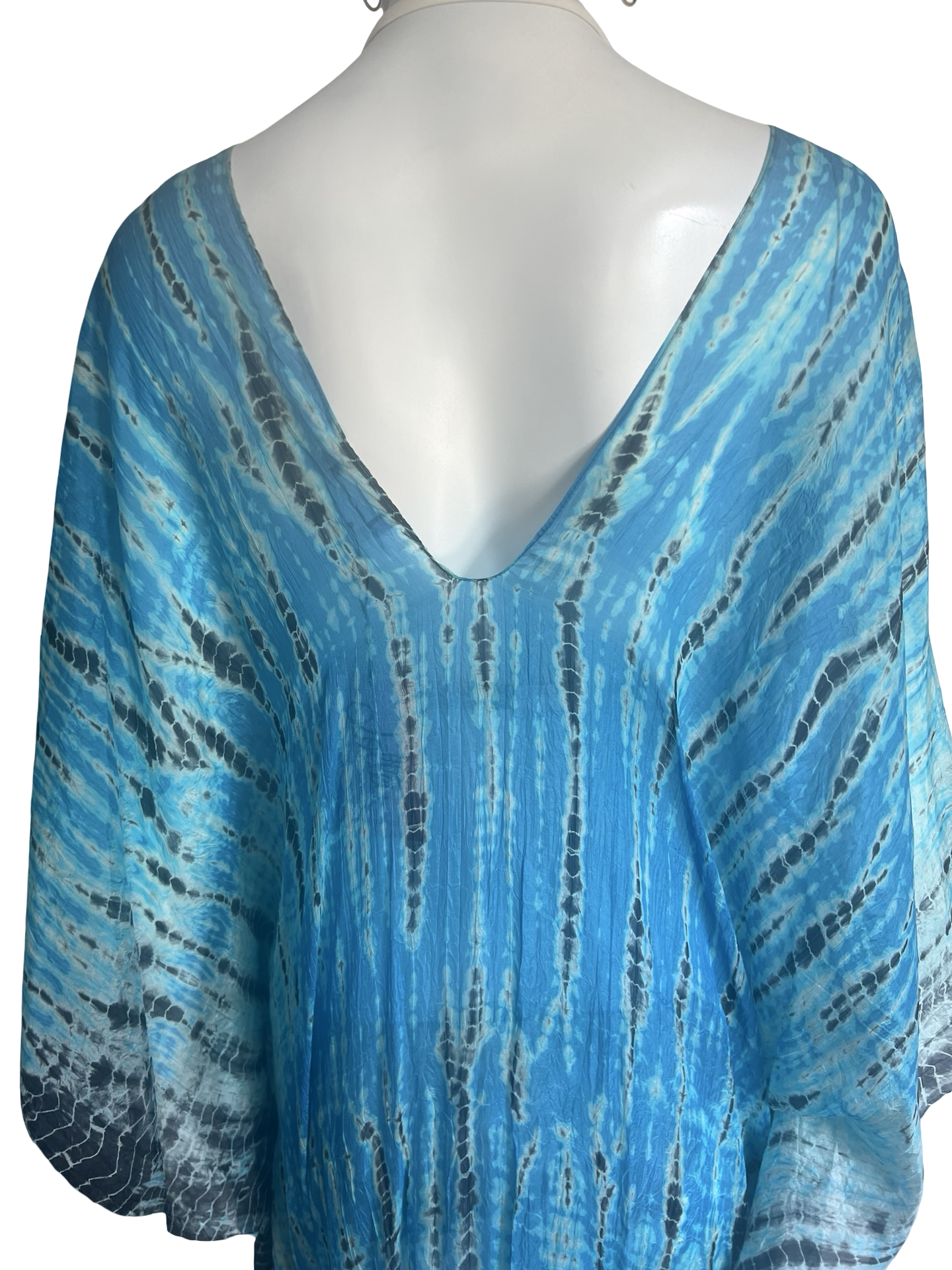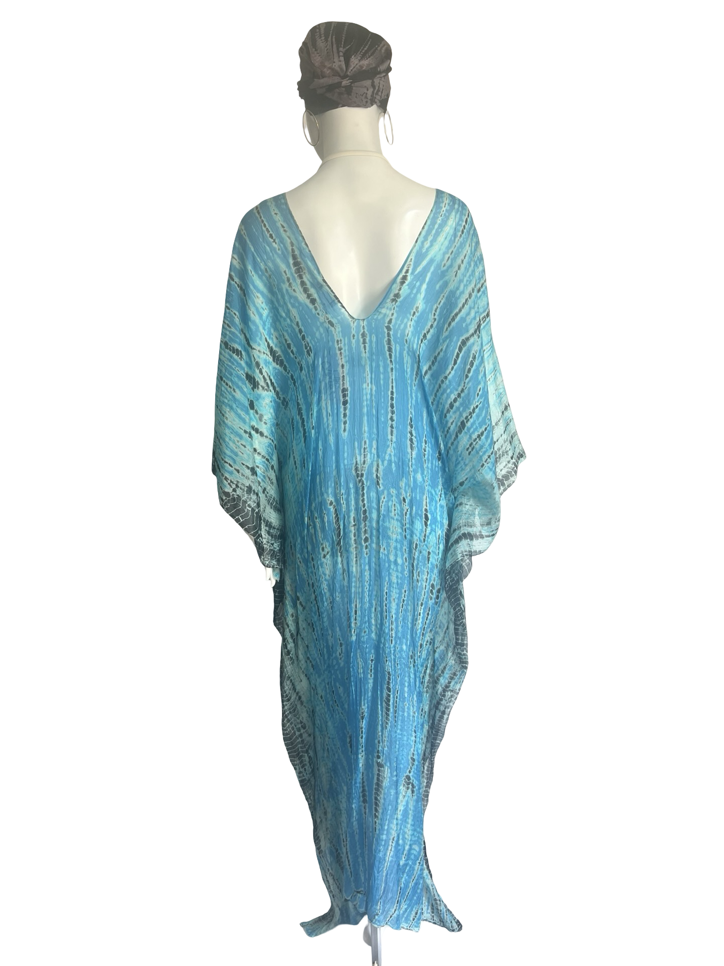 Our "Long Cover Up Kaftan" in our beautiful hand tie dye Silk Tabi quality is an easy but elegant kaftan to throw on and go. The fabric has undergone a lengthy wash process for the fabric to be incredibly soft. Great over swimwear or worn on its own over a slip dress as a casual dress for party or daytime. This blue is piercing blue with black tie dye streaks and a very striking LUXE look.The kaftan is a One Size fits all and can accommodate XS-3XL.