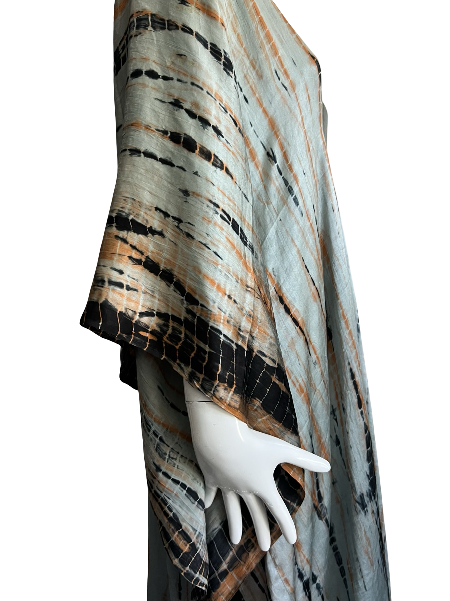 - Print Process: 100% hand tie dye silk, deep grey base & dramatic black & orange tie dye lines. Every item is made by hand and a one of a kind item & limited items will be made in this style