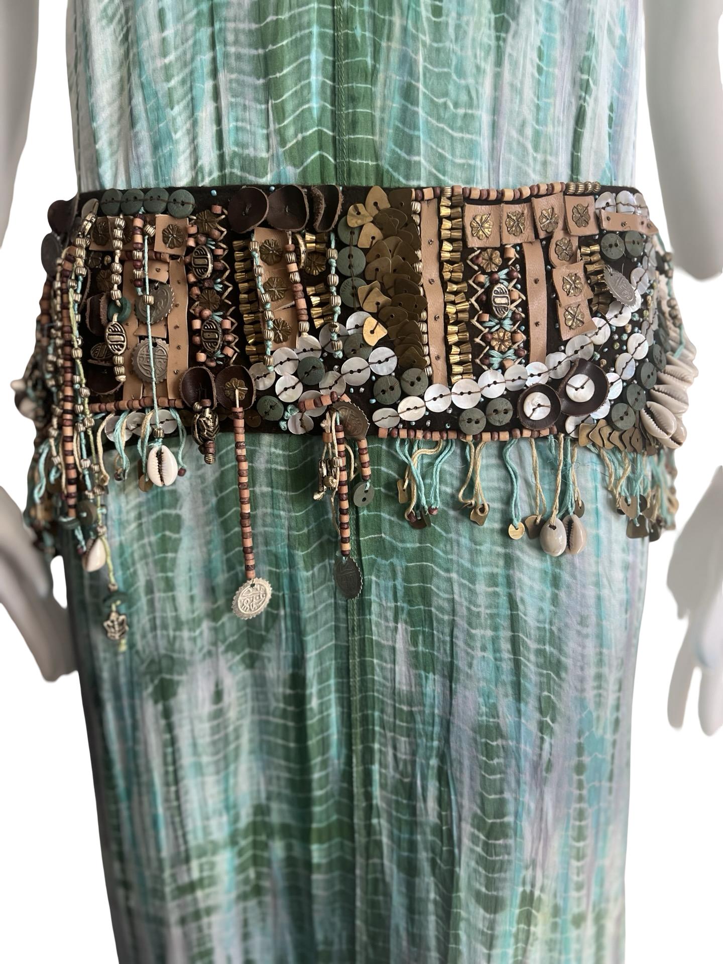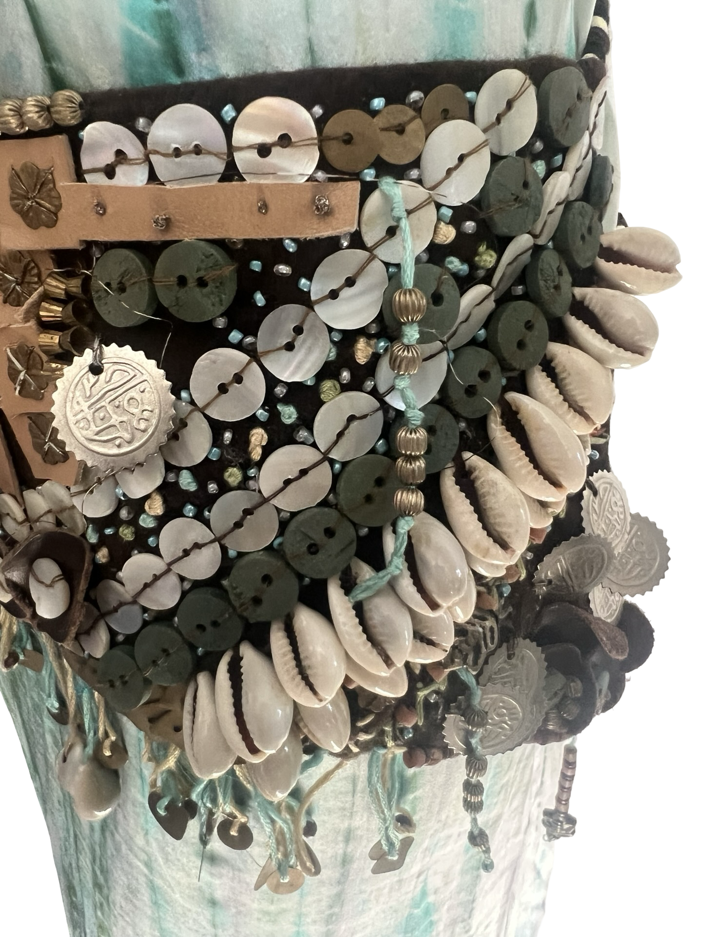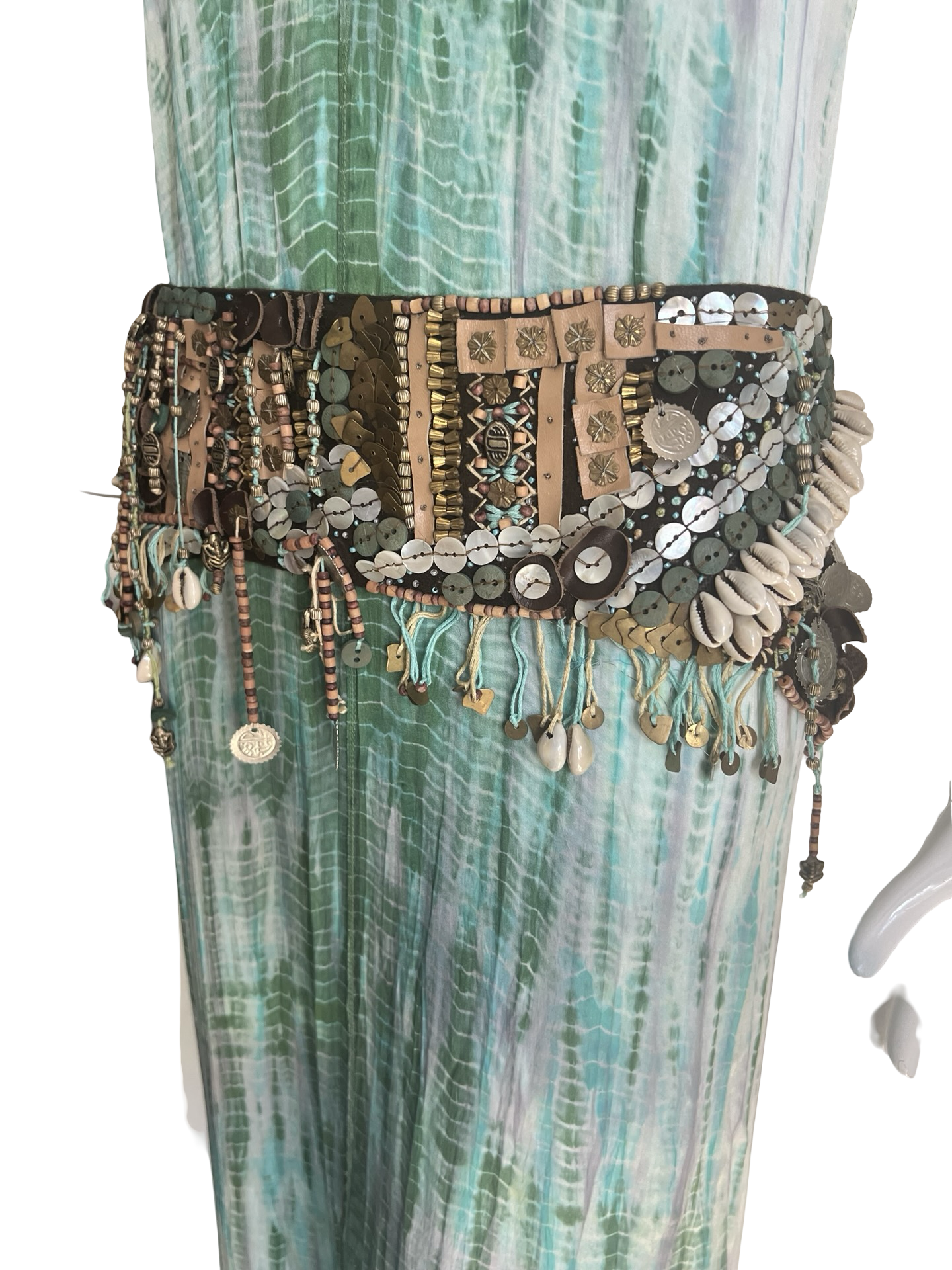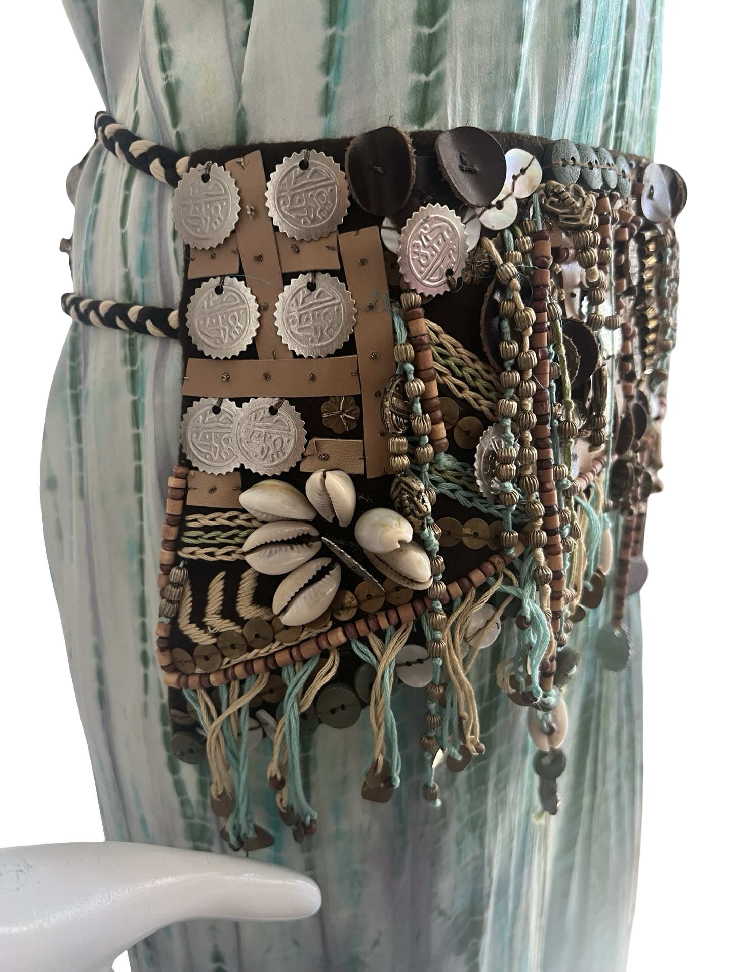 This is the ultimate "main character" accessory! This is a signature Lotta Gypsy Belt that is giving serious Coachella-meets-boho-artisan vibes. It's sold single or double. Buy one and wear as shown in the images or get 2, a pair and wear one belt front and other back and tie the belt in the sides or the body. You can tie it higher for a waist belt or lower for the "gypset look".