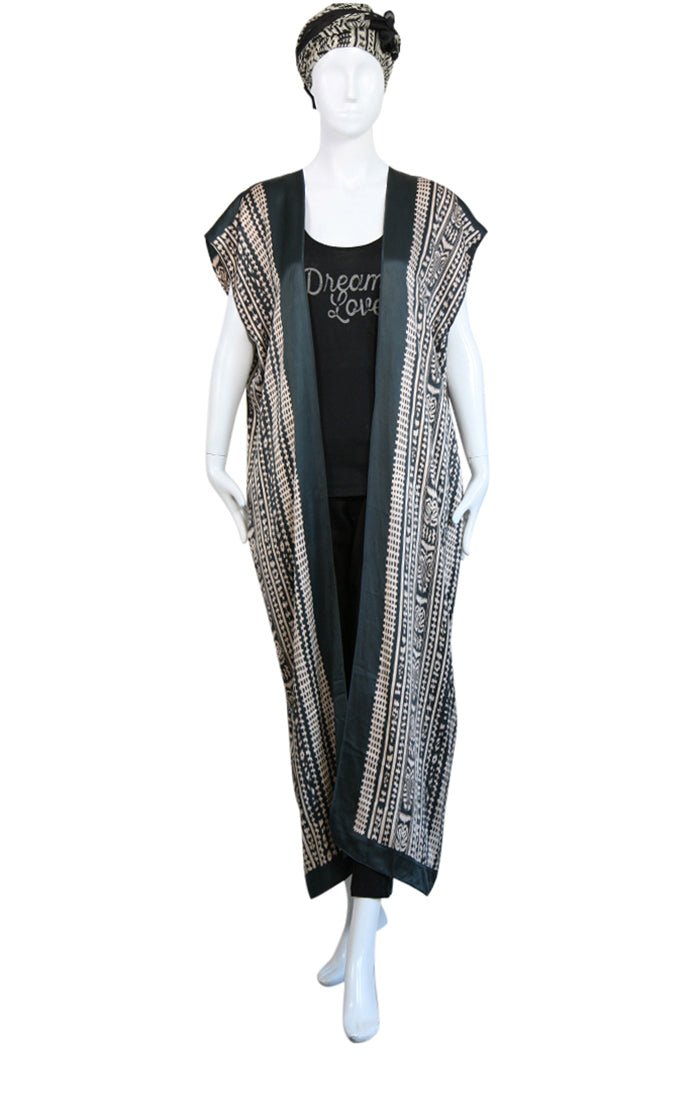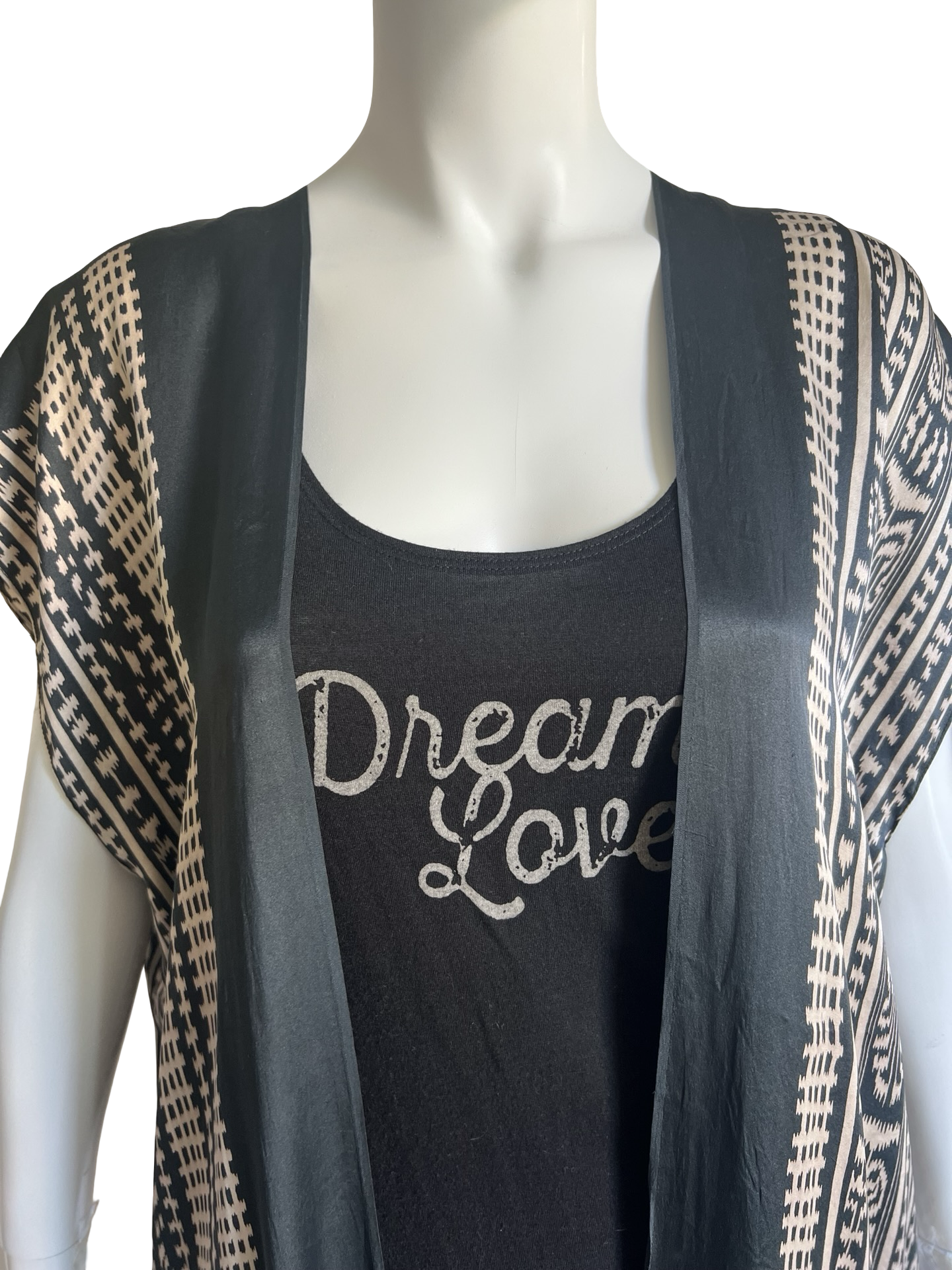 This duster is a easy throw on and go shape. Over jeans. leggings, skirt & over a tank-top, its a chic effortless look. Would be a very nice high end cover up also. The duster is 41" across the body and good for S-L, and we call it one size.