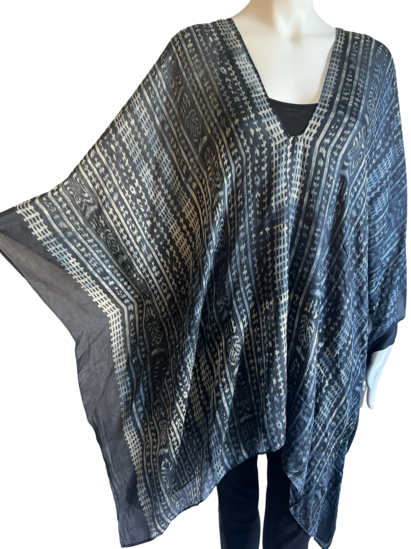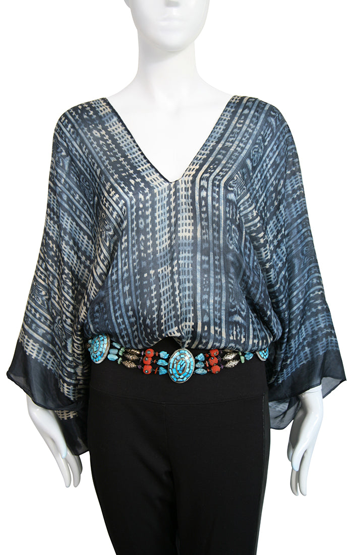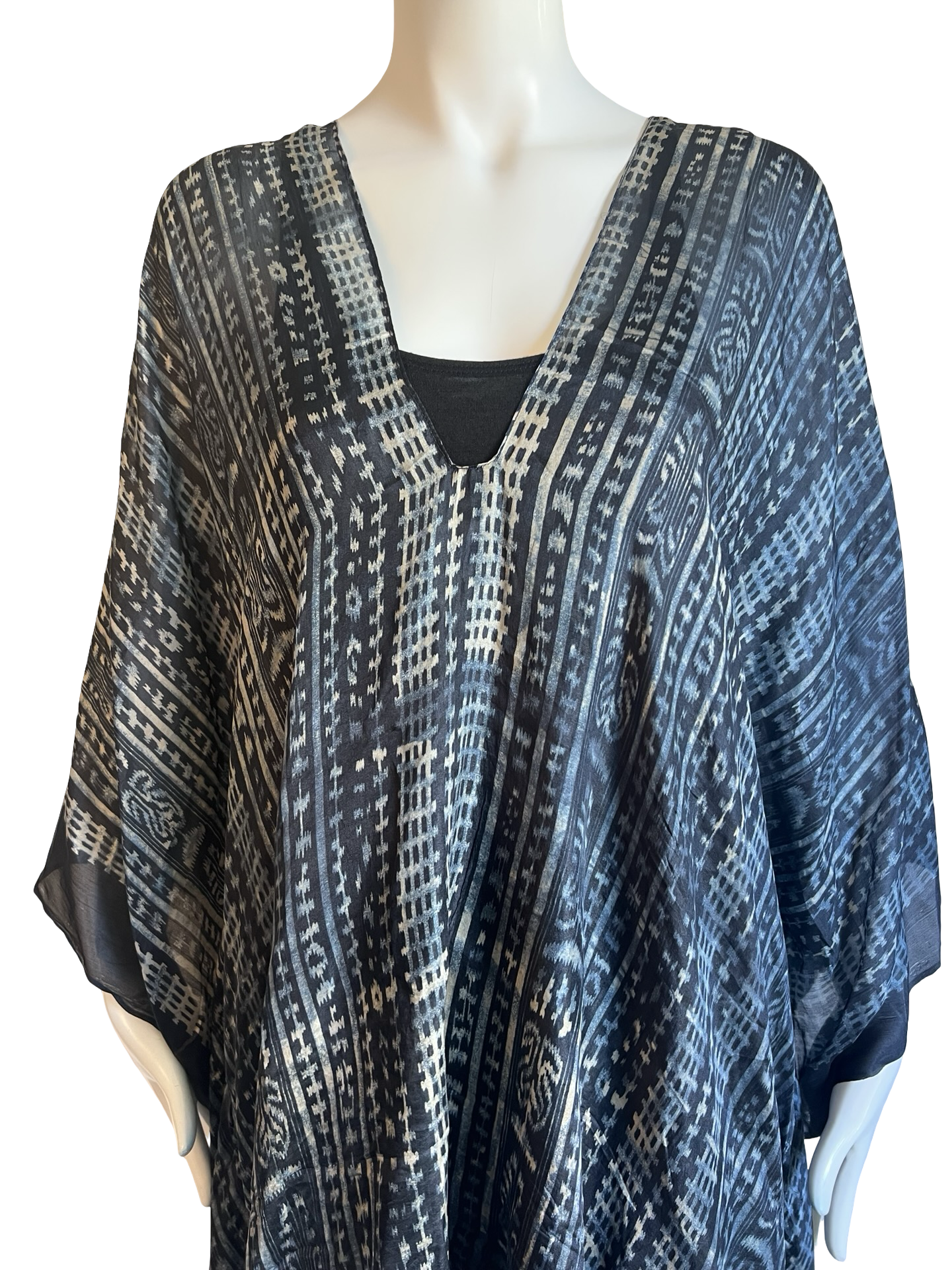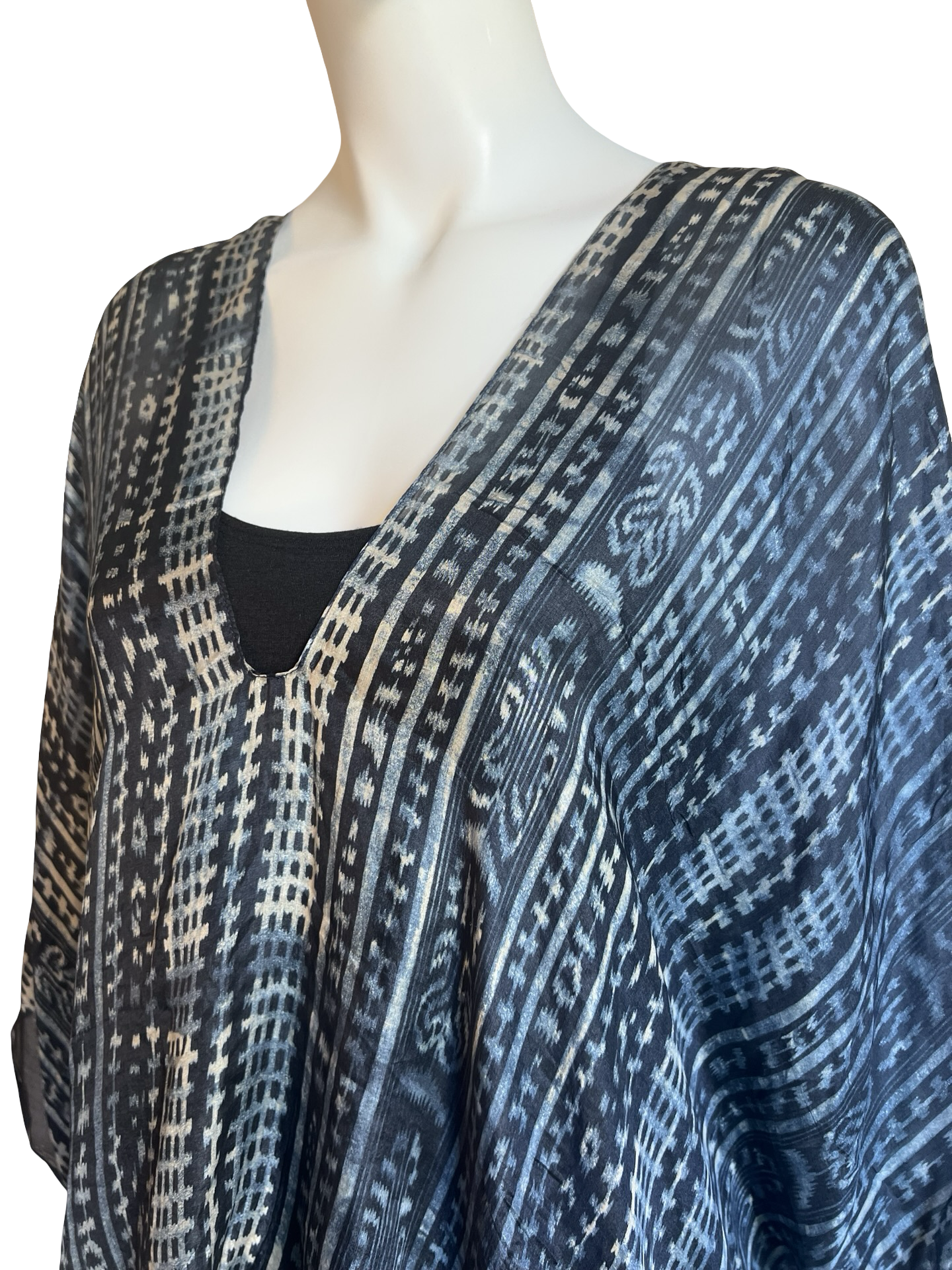 This IKAT is one of our signature silk prints which is hand dyed and this print has a very vintage distressed look, which gives it a very Boho Vibe.