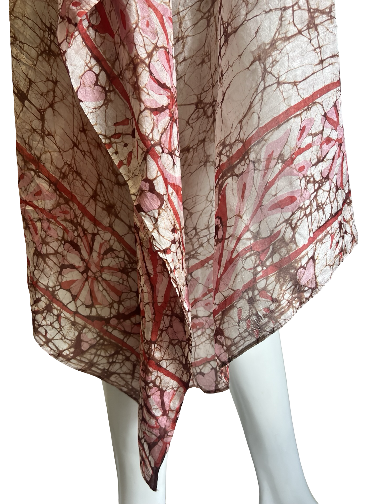 - Print Process: 100% hand batik and every item is made by hand and a one of a kind item. This is a ivory batik base with beautiful reds, pinks & browns in the print.