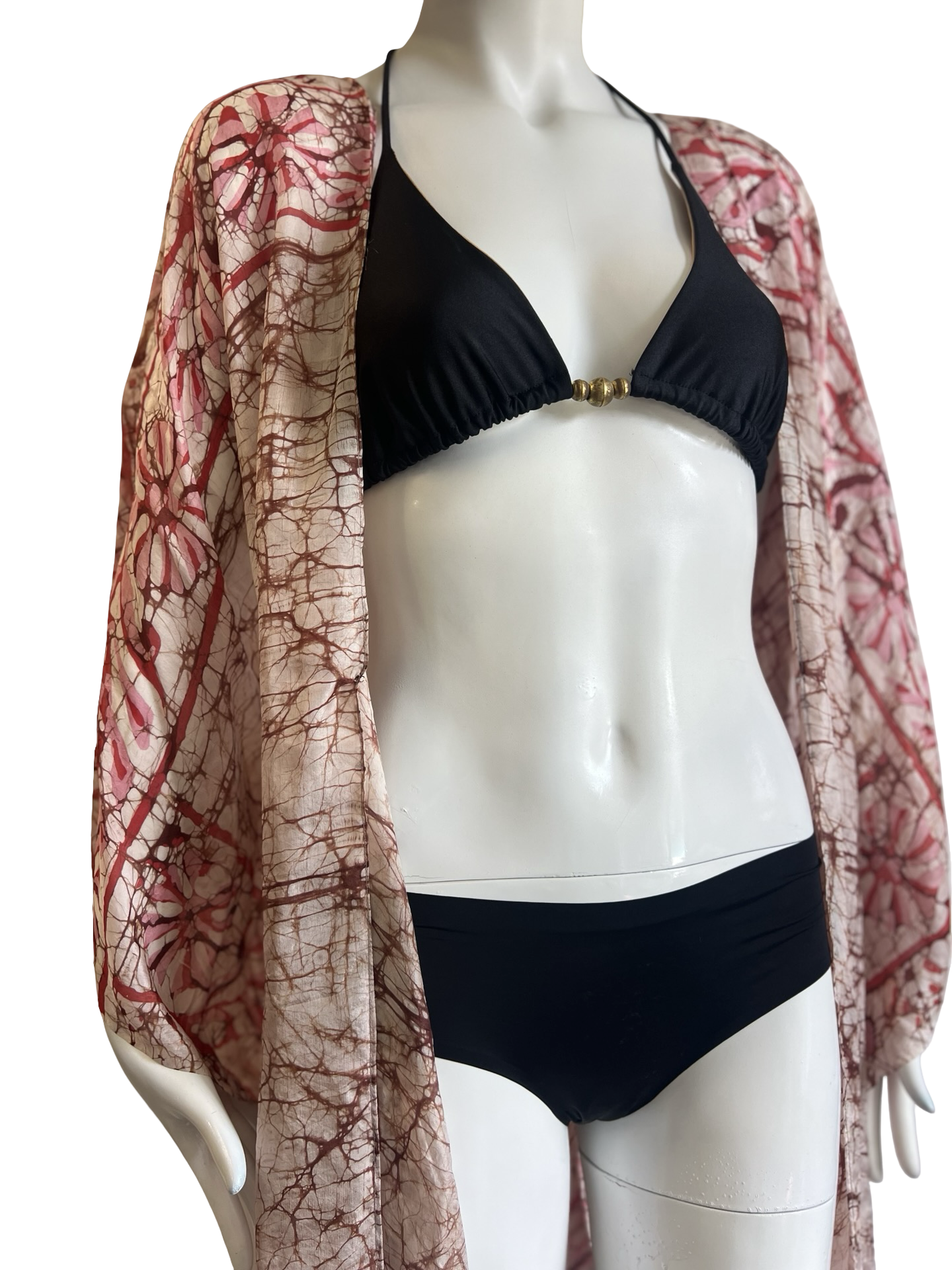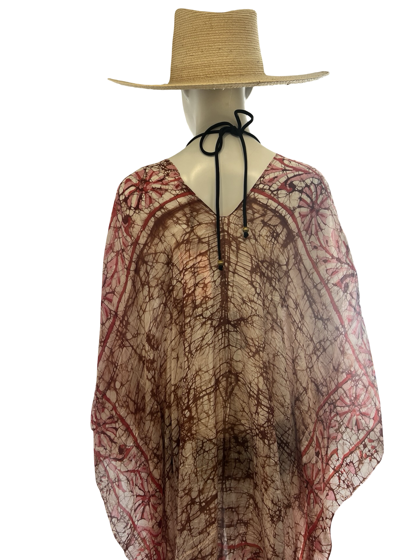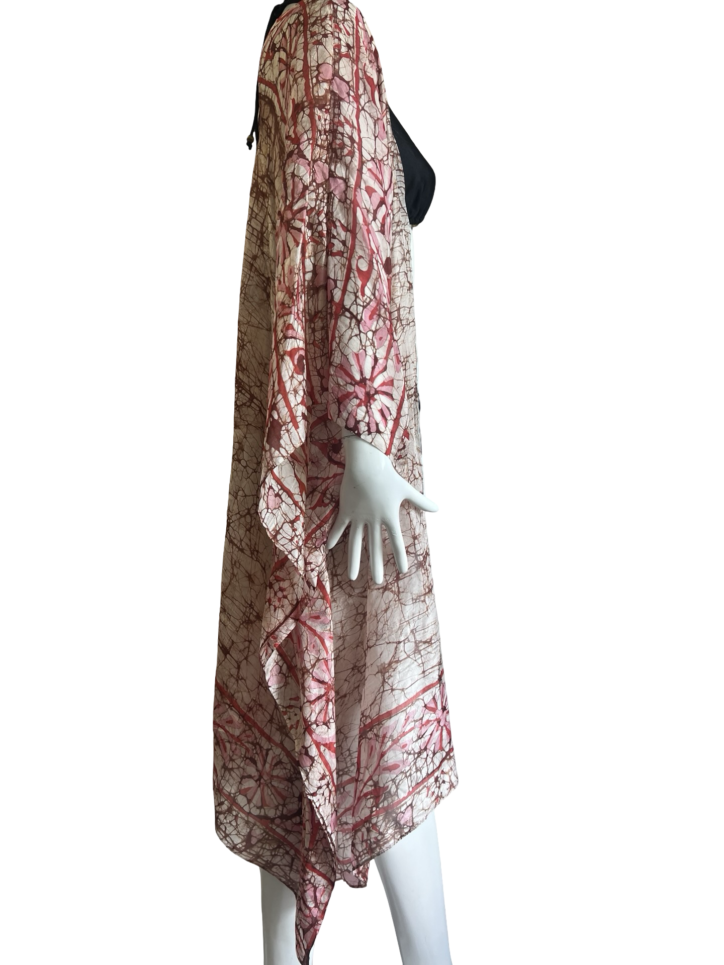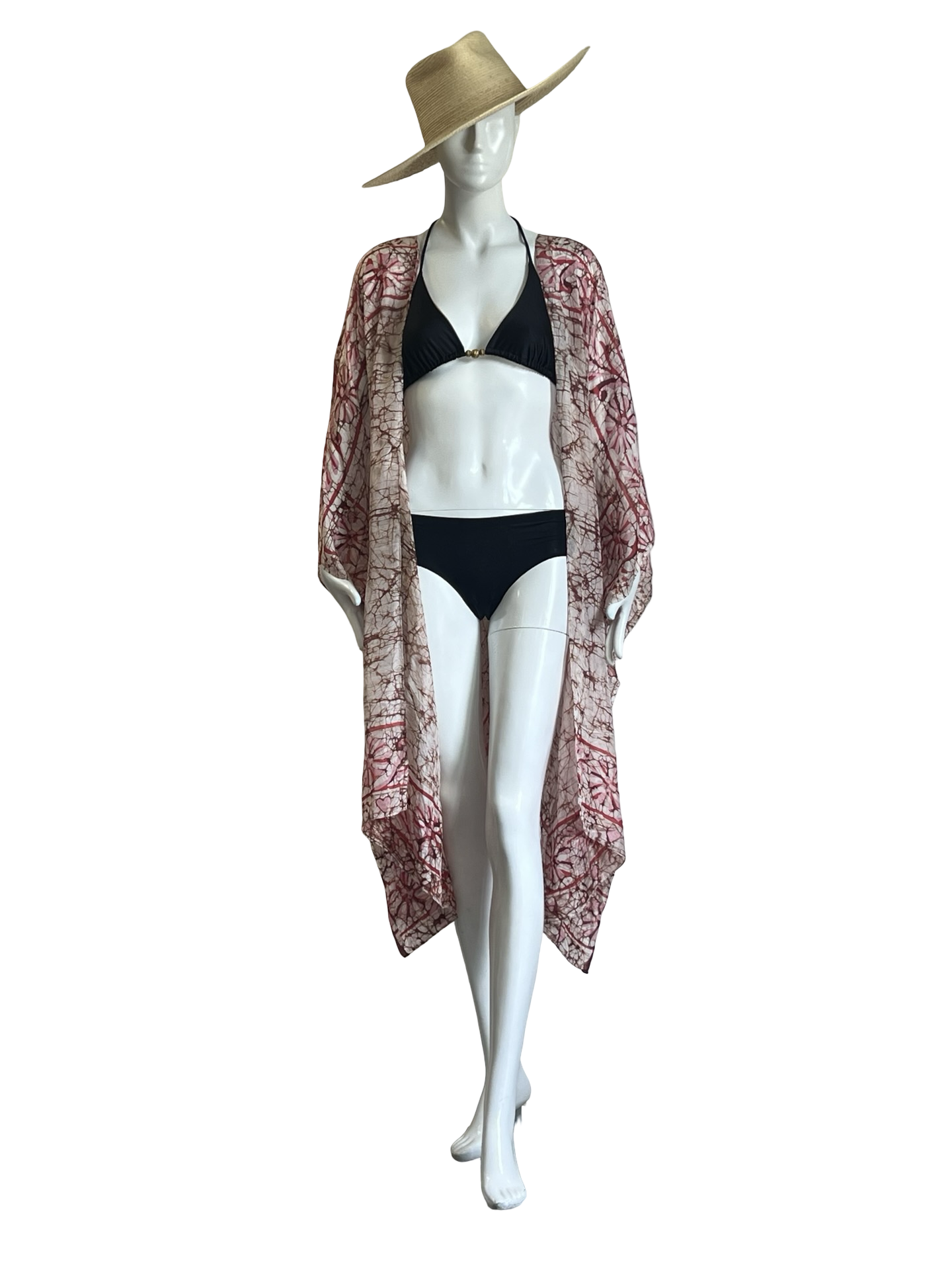 Our “Knee Length Long Open Front Kaftan” is made out of a thin fine silk tabi fabric thats a 100% hand batik print. The fabric is washed down to be incredibly soft with a great soft flow to the fabric. The shape is a simple layering Kaftan that is one size fits all. Center front around the bust area has a small hook & eye closure. The kaftan is a elegant but sexy cover up option over swimwear but also a lovely layering item over a dress, or pant & tank top for day to night. The kaftans become what you layer them over for beach, pool to bar, or a day or evening look. Our cover ups are the perfect travel item as they fold up into a napkin size in the luggage.