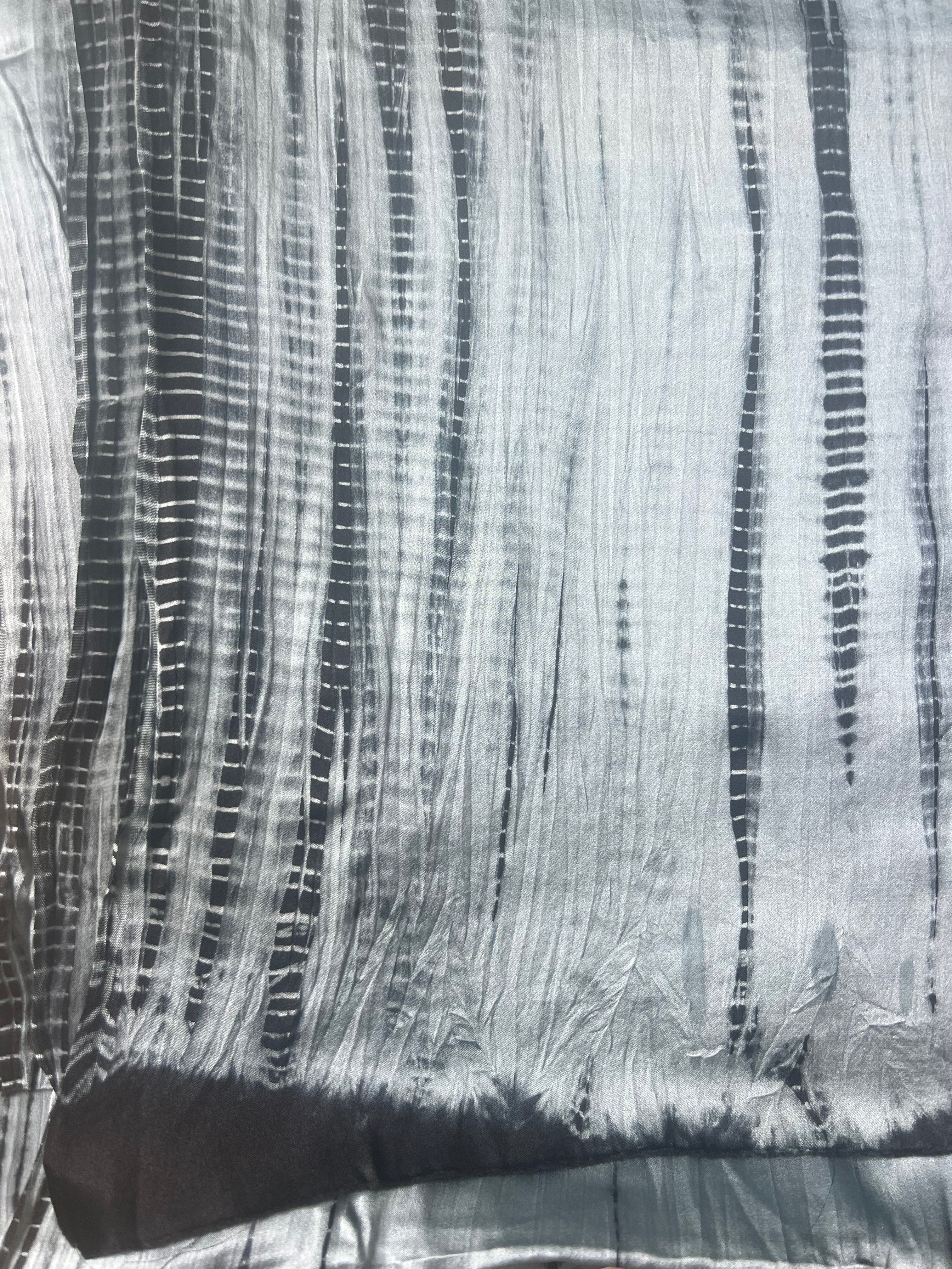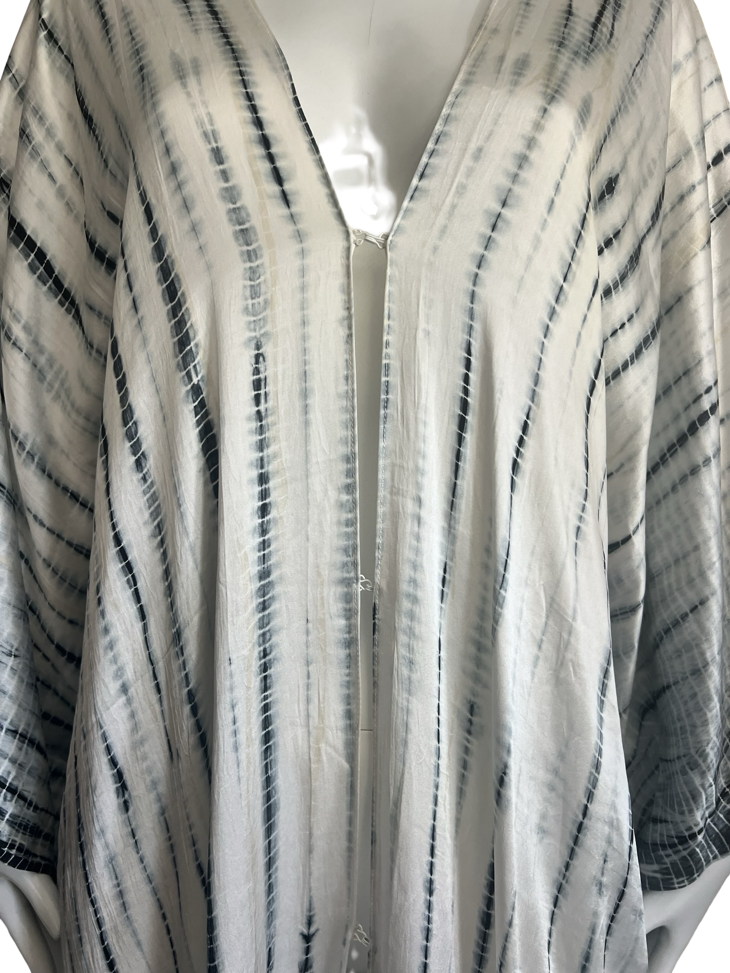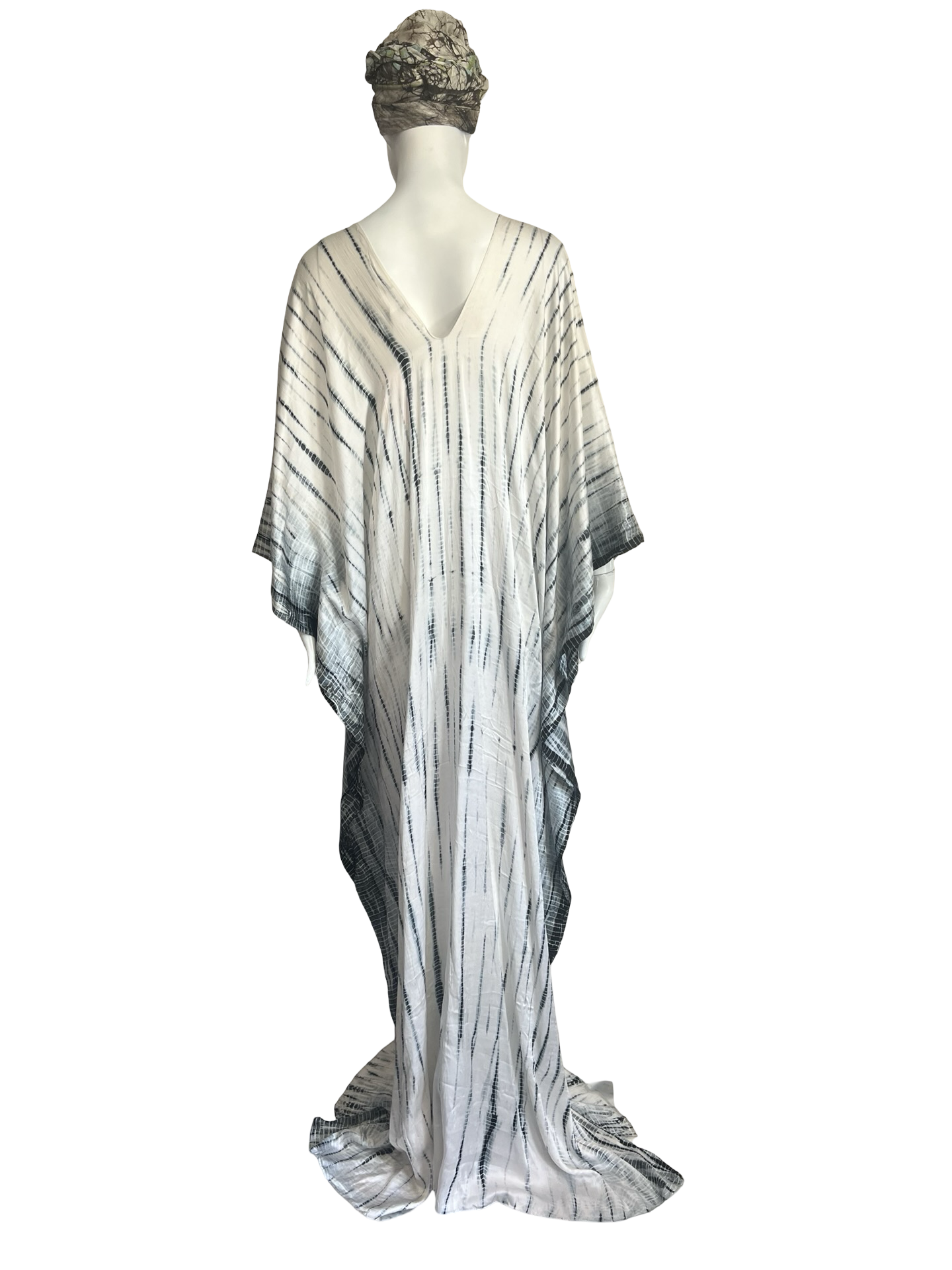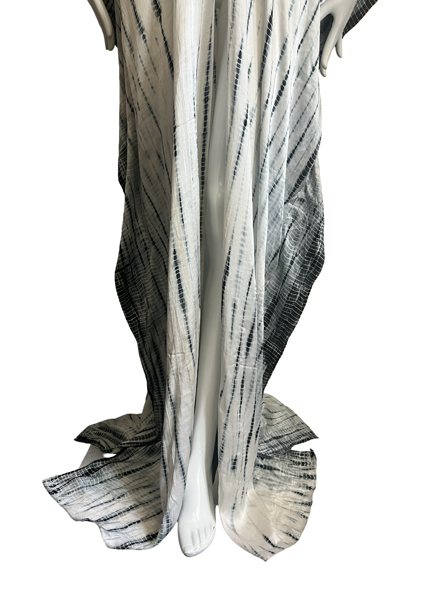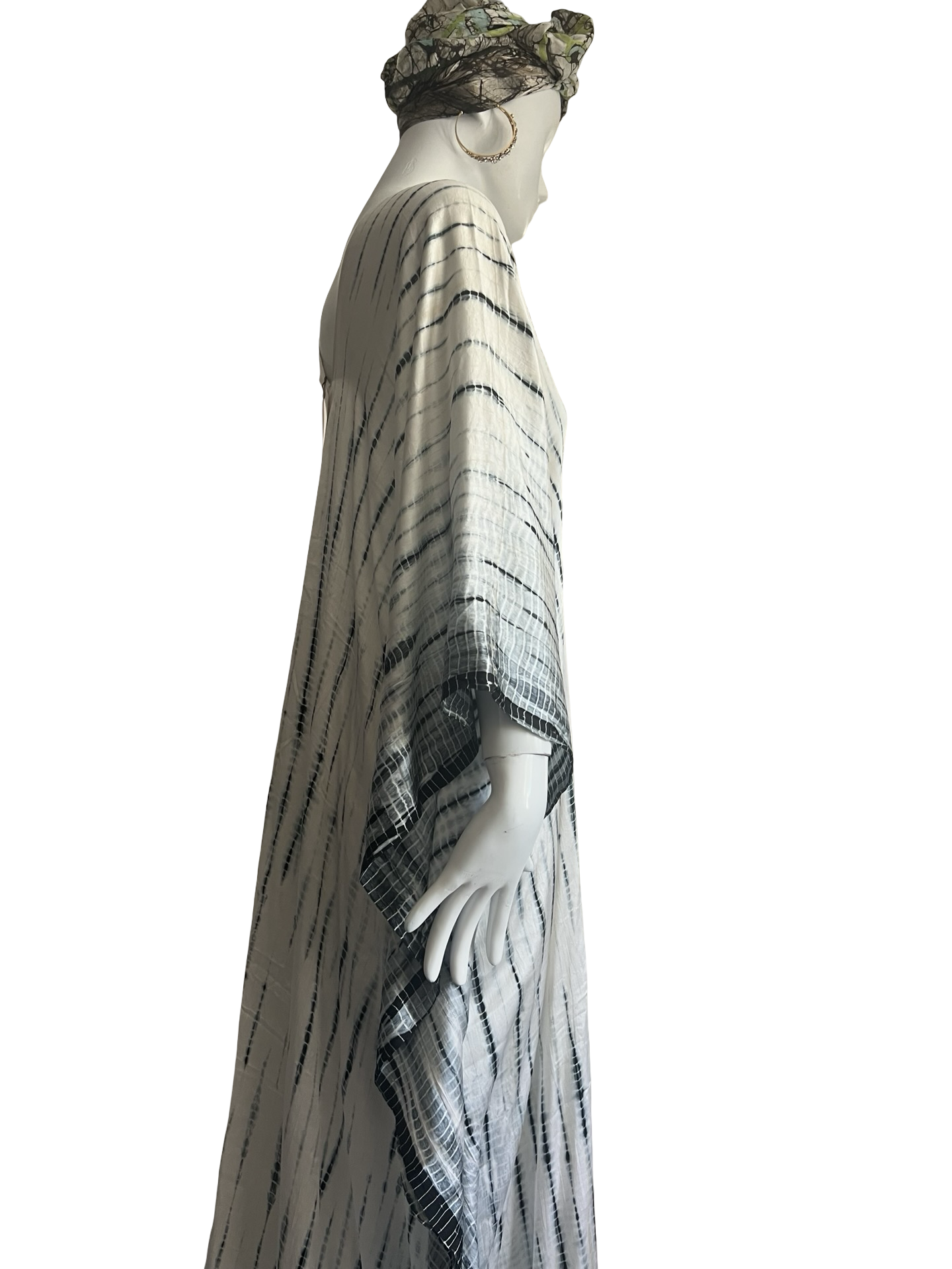 Indulge in the ultimate expression of luxury with our Extra Long Silk Kaftan. Crafted from our signature high-quality 100% Tie Dye Silk Charmeuse, this piece is designed for those who embrace high-drama style. Featuring a stunning, handmade tie-dye pattern with a deep grey base and dramatic black accents, no two kaftans are exactly alike.