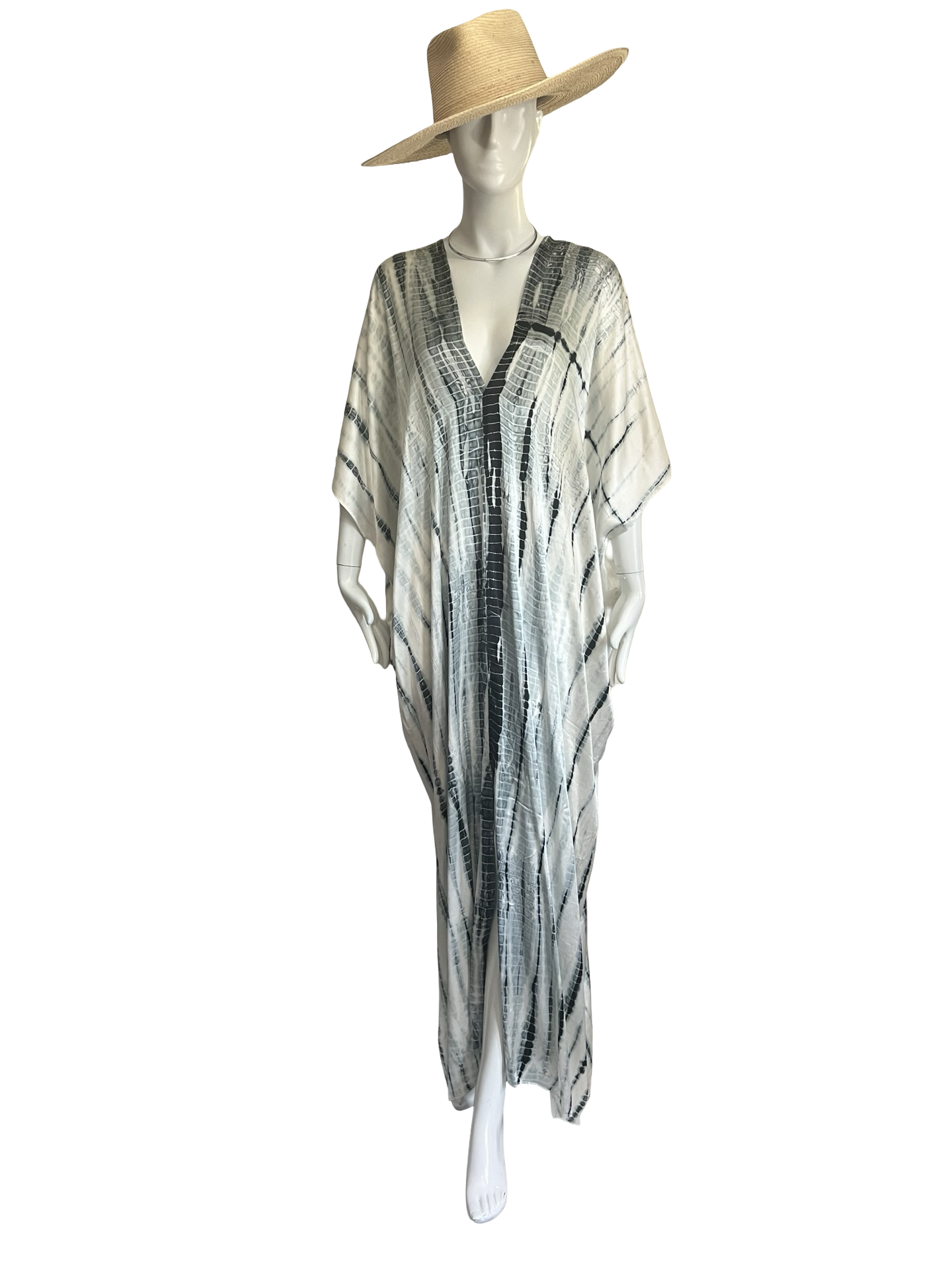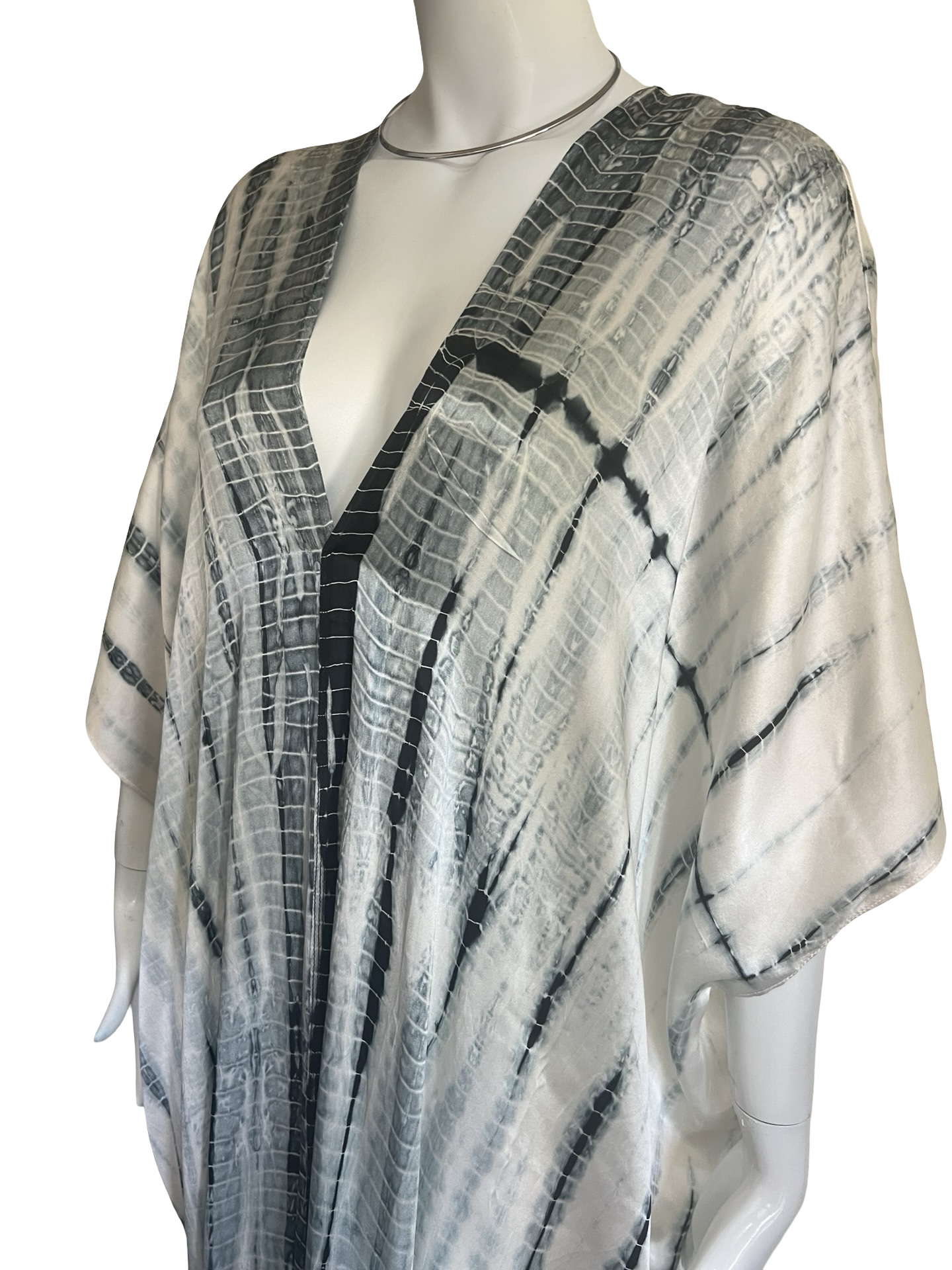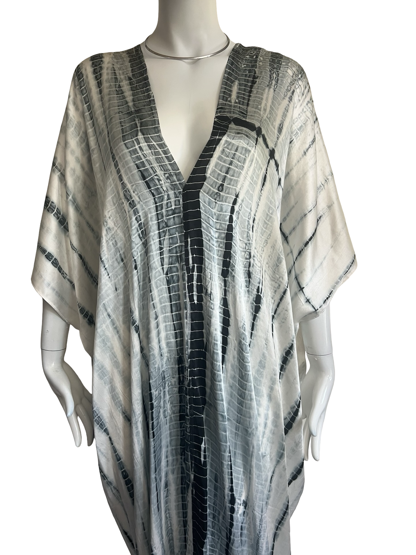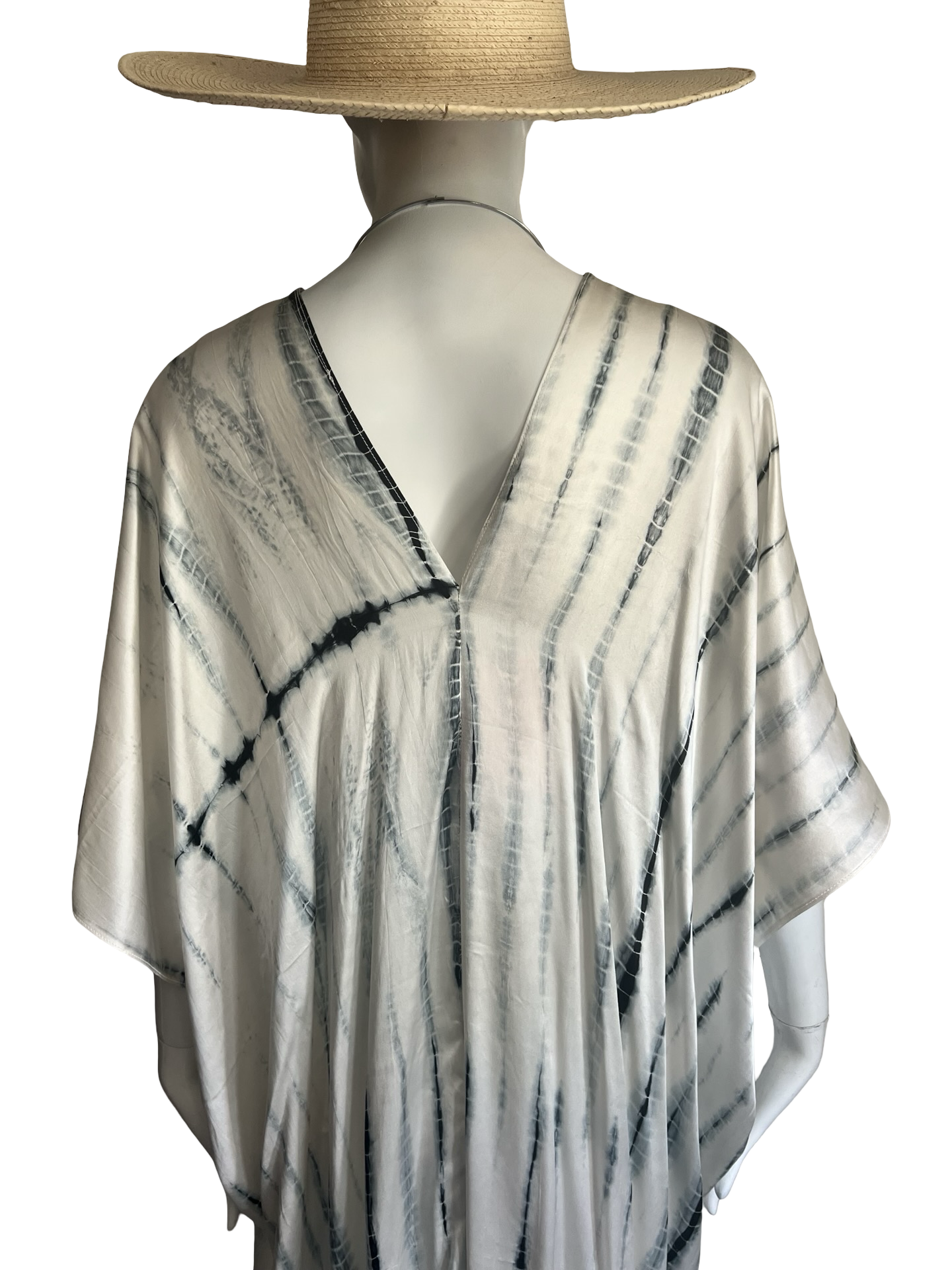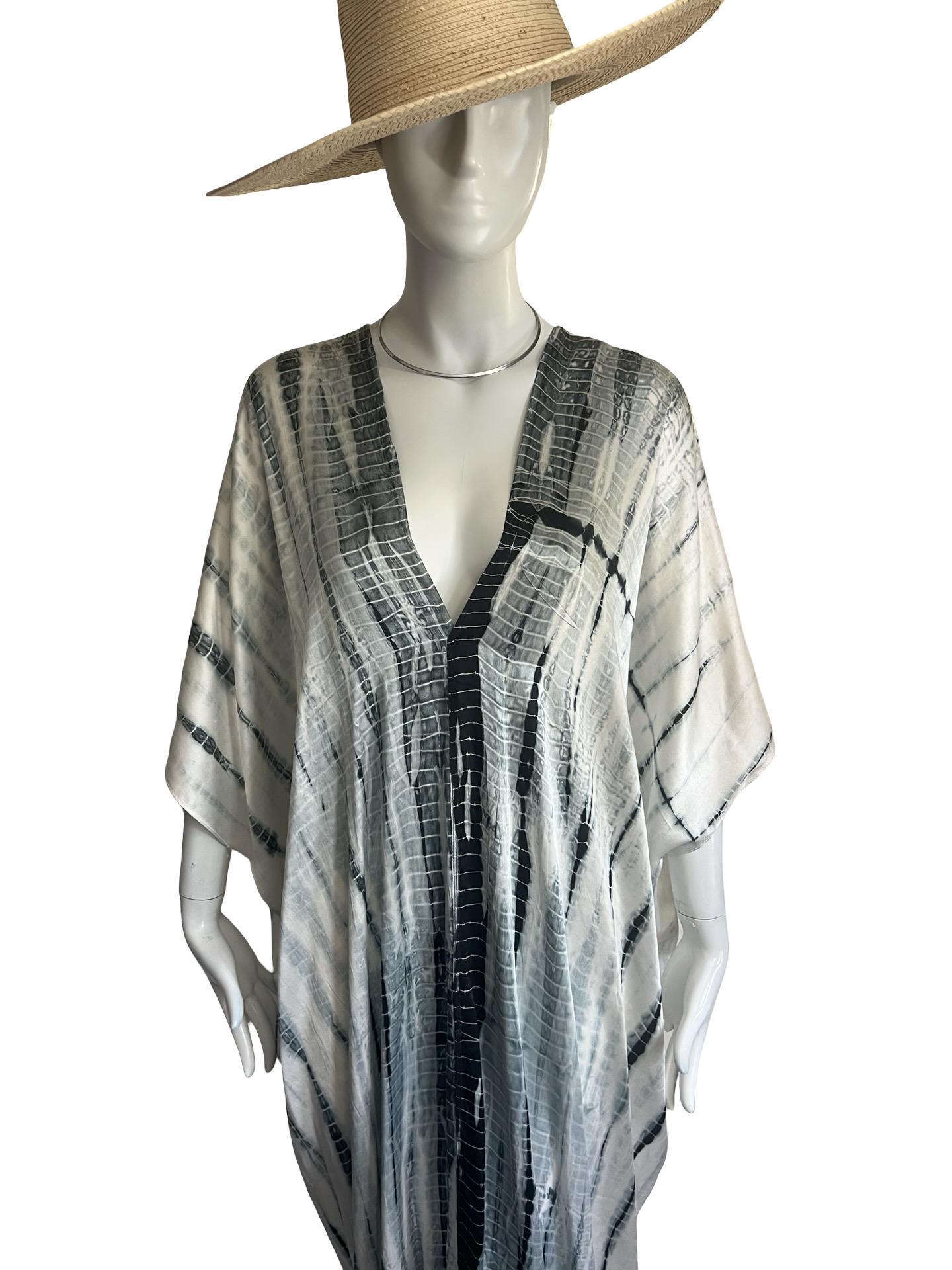 Indulge in the ultimate expression of luxury with our handmade silk kaftans. Crafted from our signature high-quality 100% Silk Charmeuse, these pieces are designed for those who embrace high-drama style and effortless elegance. Featuring a stunning, handmade tie-dye pattern with a white base and dramatic black accents, no two items are exactly alike. See 4 more color options : Slate w black, Blue, Silver & Forest.
