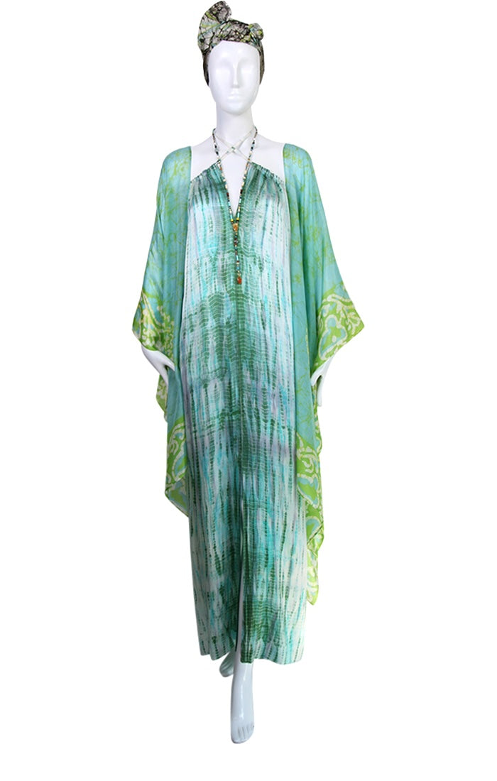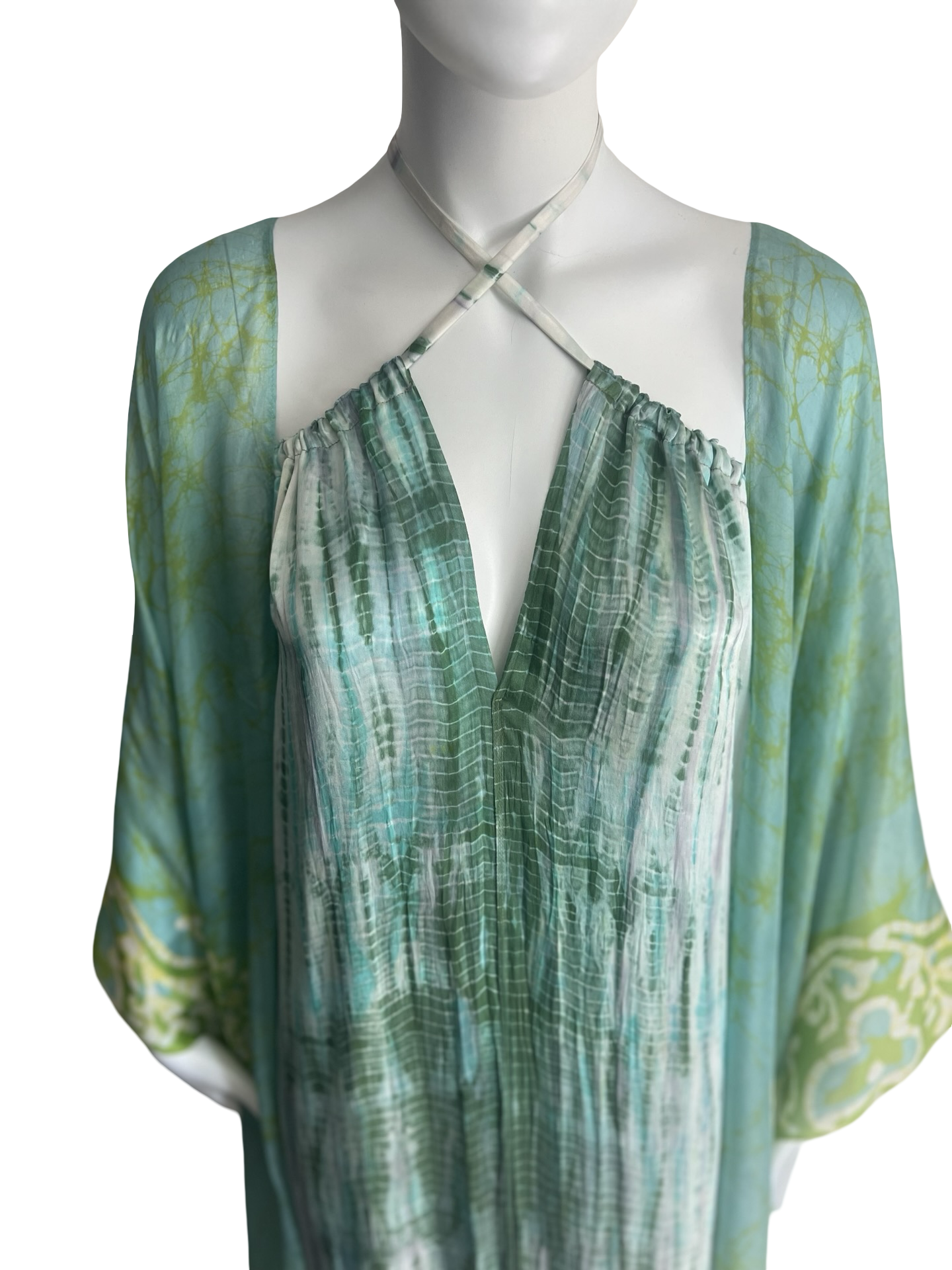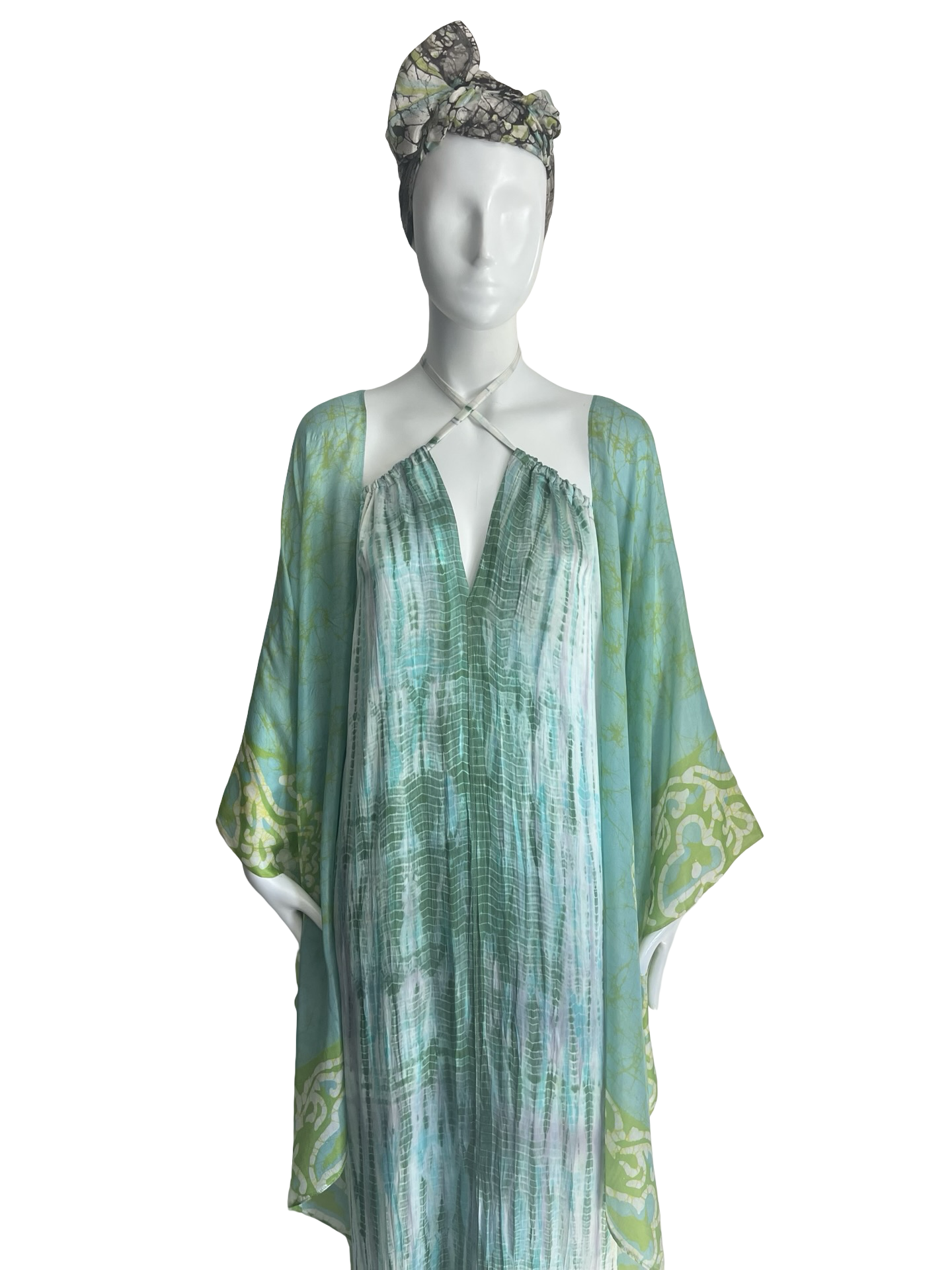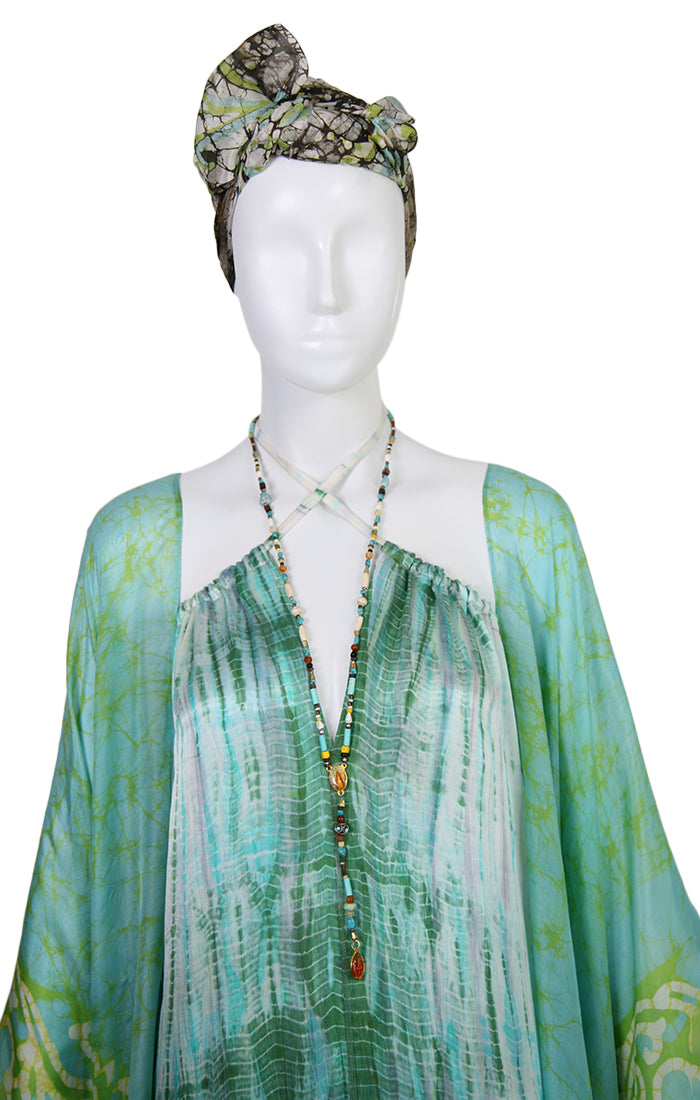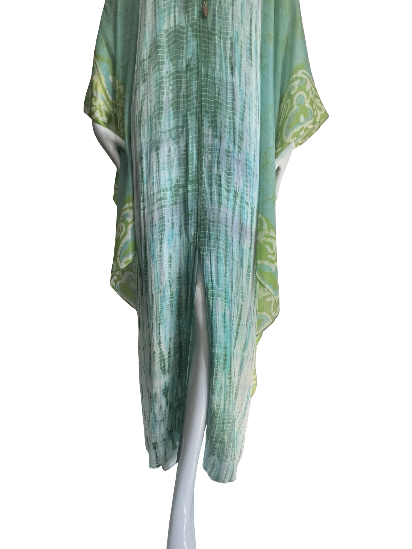 Artisanship: 100% Hand Tie-Dyed; a one-of-a-kind, limited edition artisanal piece. This is a beautiful soft bone white w aqua, limes and slight lavender streaks.