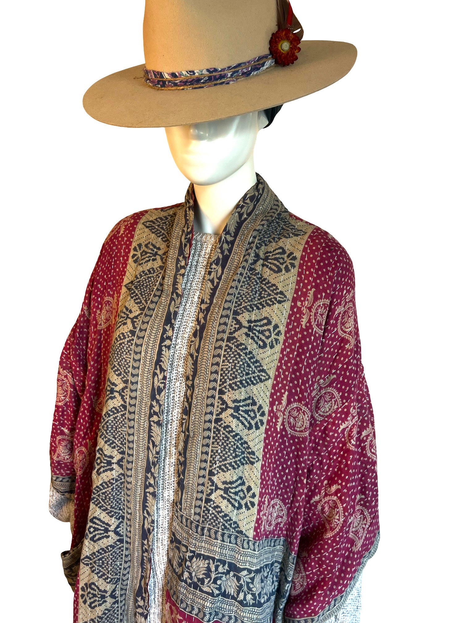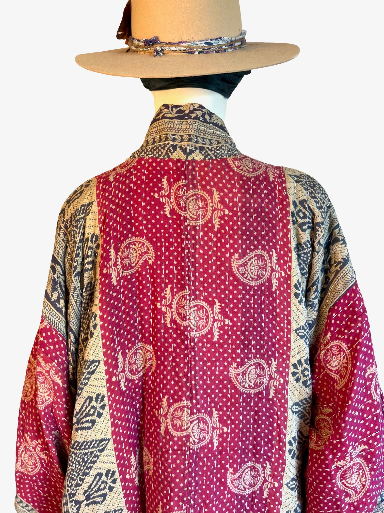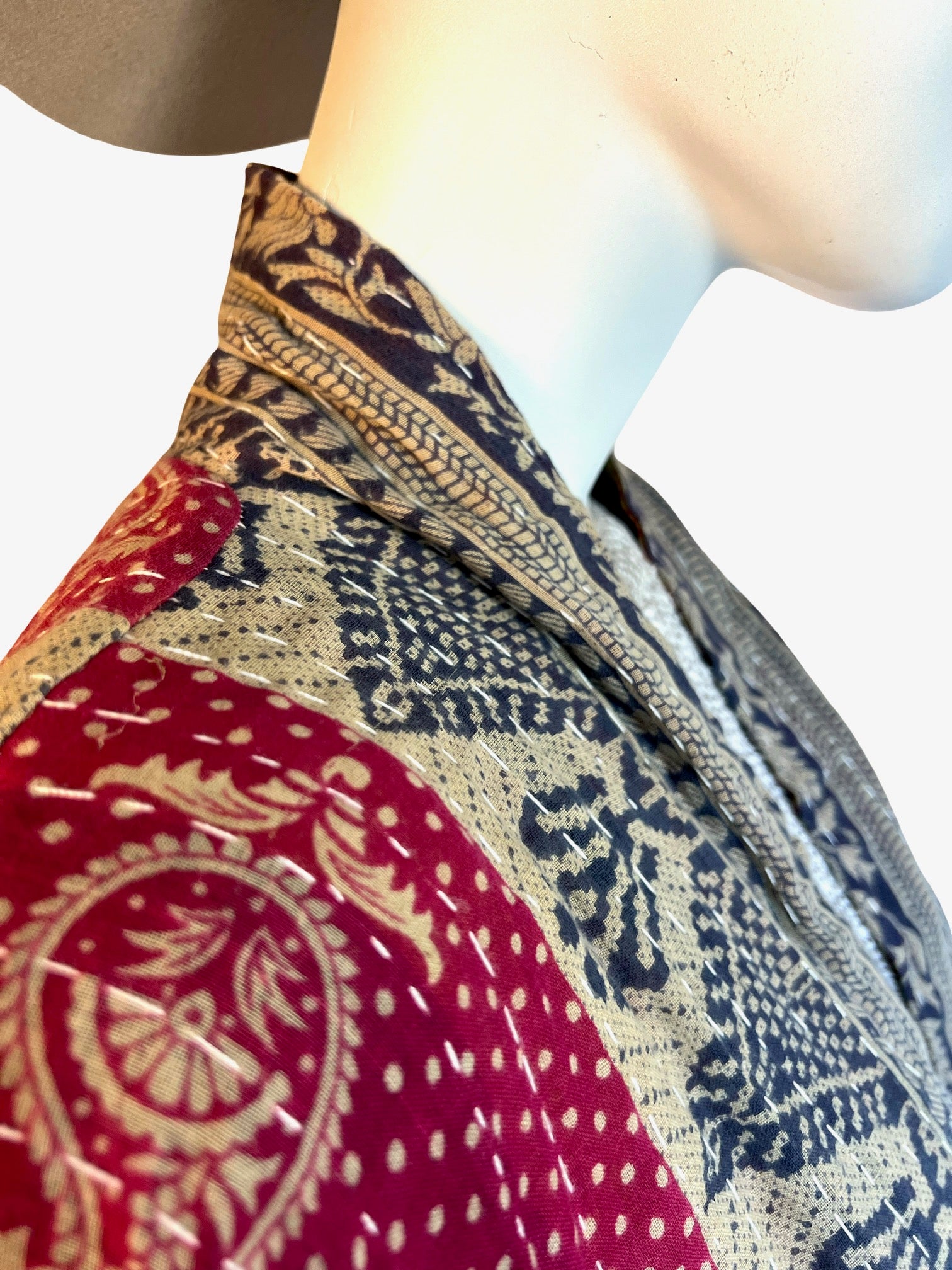 Our “Handmade Vintage Kantha Jacket” is a unique, one of a kind coat. There is only ONE jacket per design. Kantha is a type of hand made embroidery/hand stitch, a famous craft in the Bangladesh regions of India. We find One of a kind Vintage embroidered cloth’s and mixed them up. The inside and the outside consists of 2 soft cotton layers mended by us and sewn together and stacked in a whimsical hand made way and hand-stitched together to make a quilted fabric. The Jacket is lined with another soft hand printed cotton layer in another amazing print, also in Kantha stitch. This unique item is a fabric lovers dream, and the coat is such a cool Artsy look. The jacket is very warm as its double layer & perfect over your favorite sweater in the Fall/Winter. The perfect everyday topper over anything; your weekend getaway, yoga class, school drop off, play park date w the kids, or JAZZ IT UP for a night out. It's perfect for any size and figure. This pc's is sure to keep you warm and stand out in a crowd.