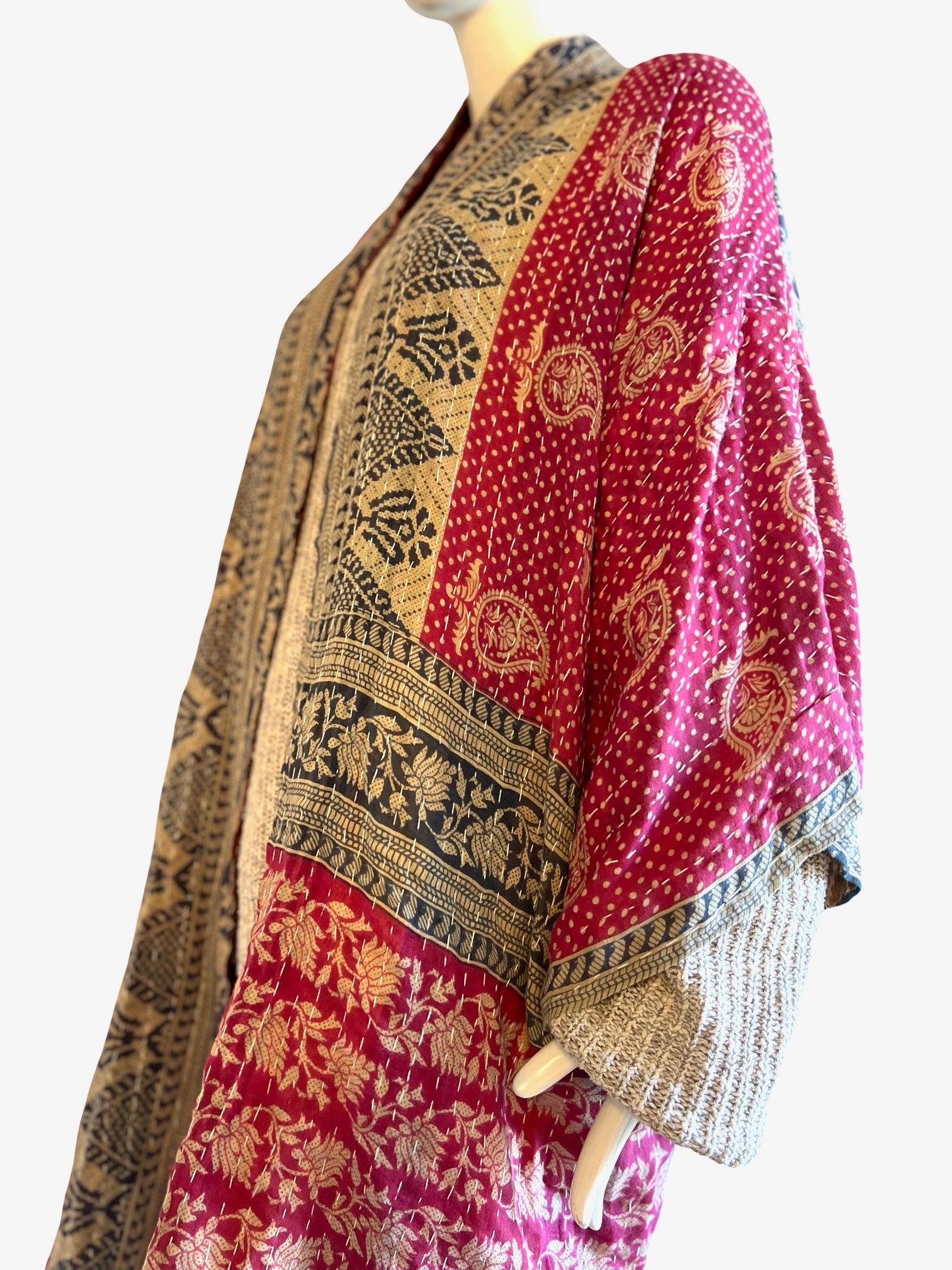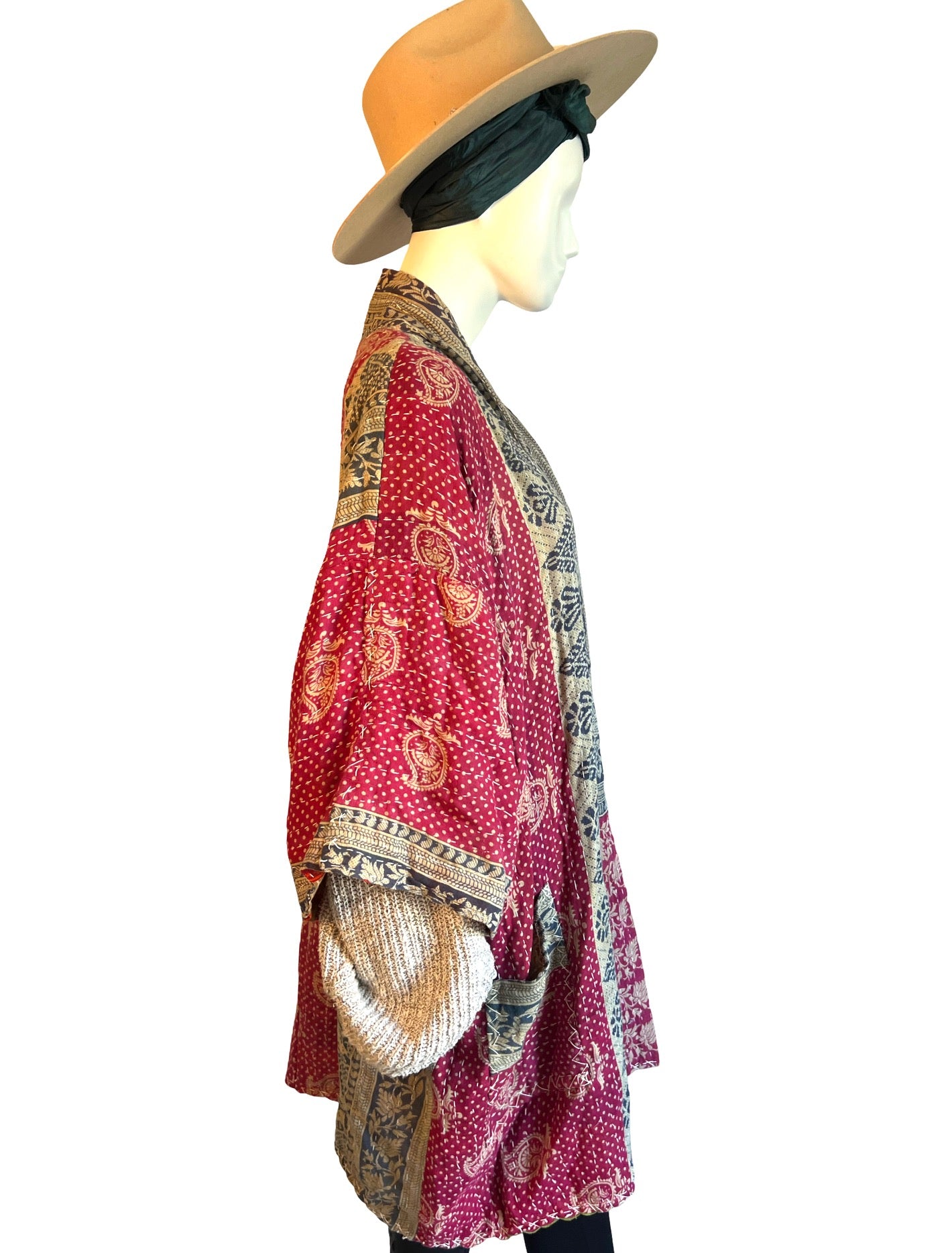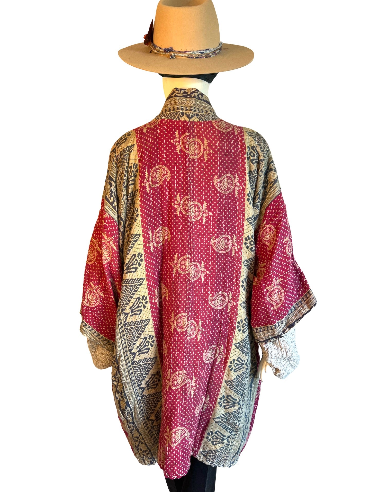 Our “Handmade Vintage Kantha Jacket” is a unique, one of a kind coat. There is only ONE jacket per design. Kantha is a type of hand made embroidery/hand stitch, a famous craft in the Bangladesh regions of India. We find One of a kind Vintage embroidered cloth’s and mixed them up. The inside and the outside consists of 2 soft cotton layers mended by us and sewn together and stacked in a whimsical hand made way and hand-stitched together to make a quilted fabric. The Jacket is lined with another soft hand printed cotton layer in another amazing print, also in Kantha stitch. This unique item is a fabric lovers dream, and the coat is such a cool Artsy look. The jacket is very warm as its double layer & perfect over your favorite sweater in the Fall/Winter. The perfect everyday topper over anything; your weekend getaway, yoga class, school drop off, play park date w the kids, or JAZZ IT UP for a night out. It's perfect for any size and figure. This pc's is sure to keep you warm and stand out in a crowd.