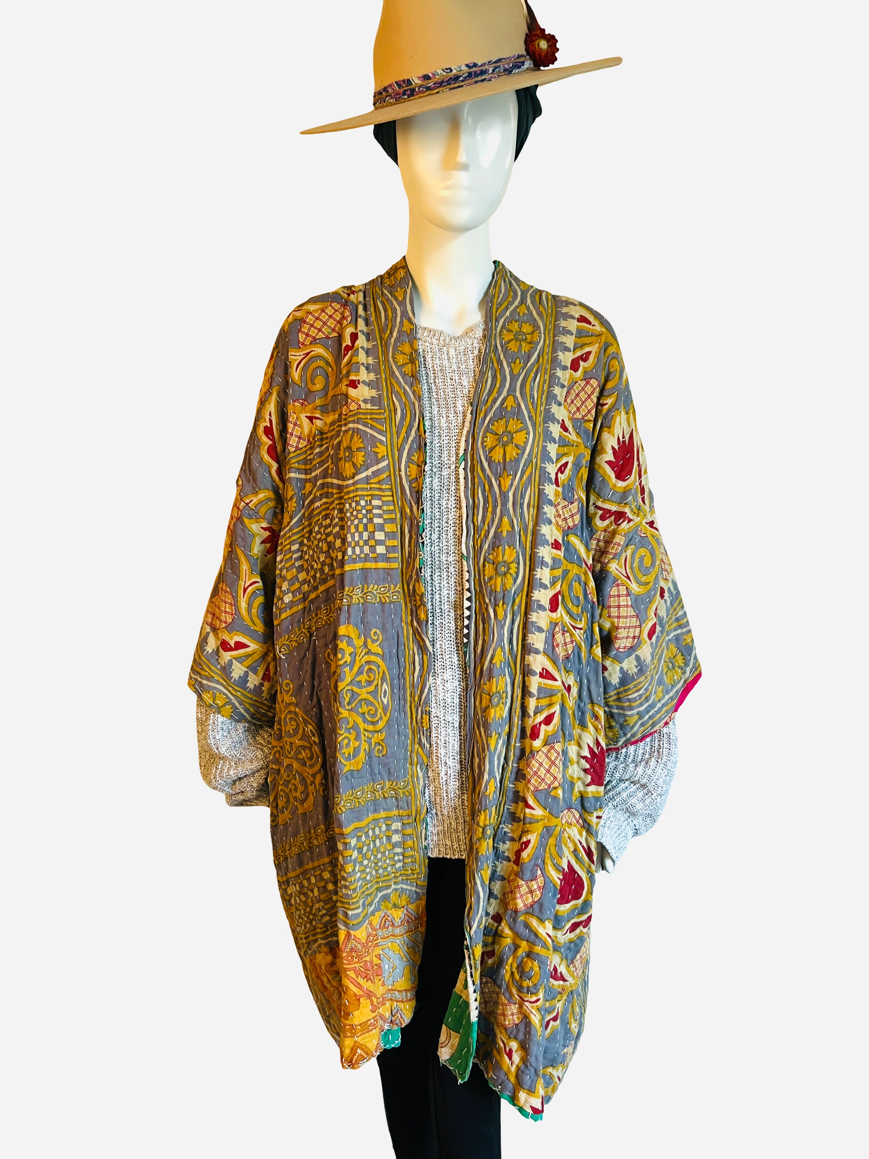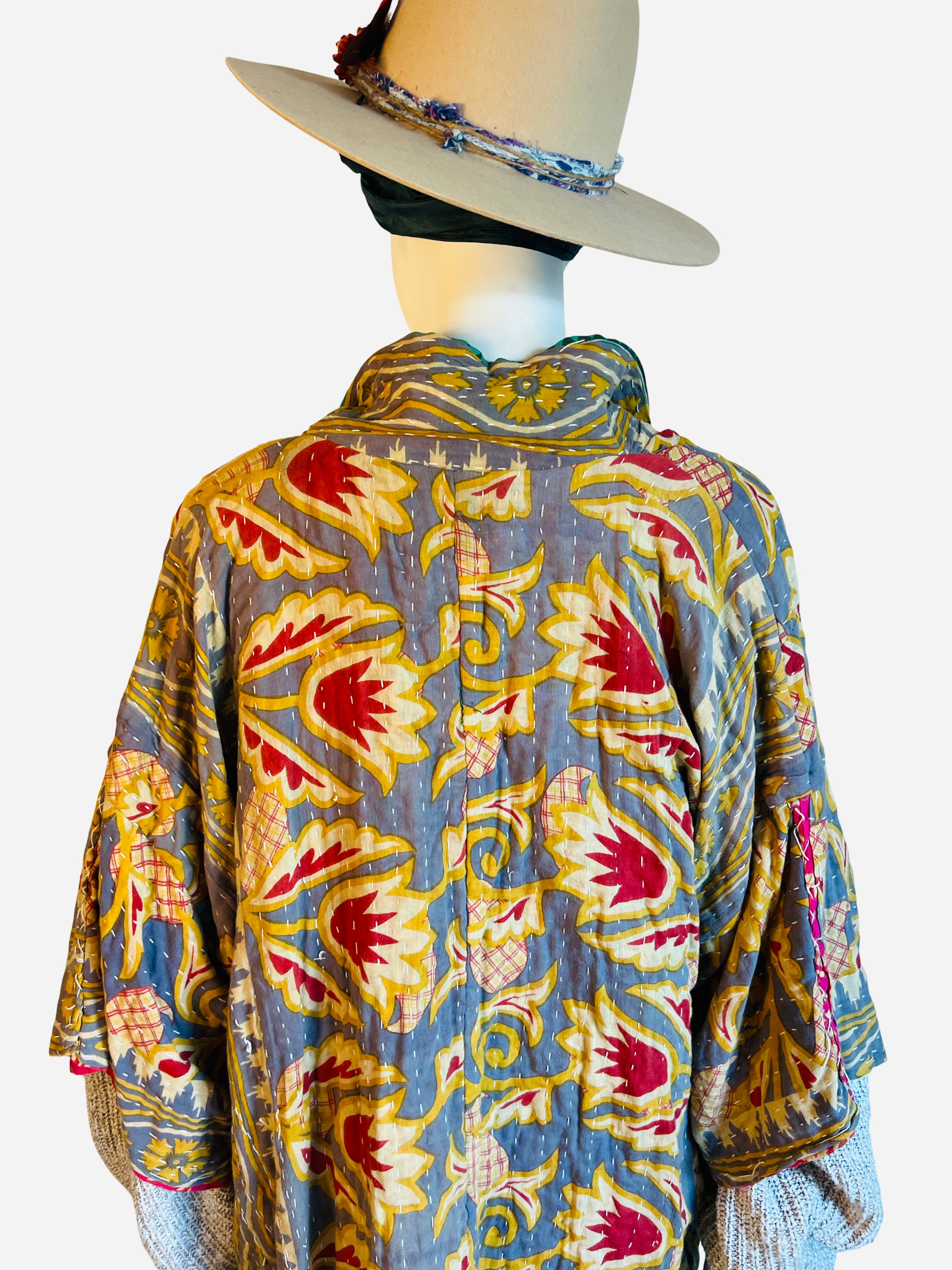 Our “Handmade Vintage Kantha Jacket” is a unique, one of a kind coat. There is only ONE jacket per design. Kantha is a type of hand made embroidery/hand stitch, a famous craft in the Bangladesh regions of India. We find One of a kind Vintage embroidered cloth’s and mixed them up. The inside and the outside consists of 2 soft cotton layers mended by us and sewn together and stacked in a whimsical hand made way and hand-stitched together to make a quilted fabric. The Jacket is lined with another soft hand printed cotton layer in another amazing print, also in Kantha stitch. This unique item is a fabric lovers dream, and the coat is such a cool Artsy look. The jacket is very warm as its double layer & perfect over your favorite sweater in the Fall/Winter. The perfect everyday topper over anything; your weekend getaway, yoga class, school drop off, play park date w the kids, or JAZZ IT UP for a night out. It's perfect for any size and figure. This pc's is sure to keep you warm and stand out in a crowd.